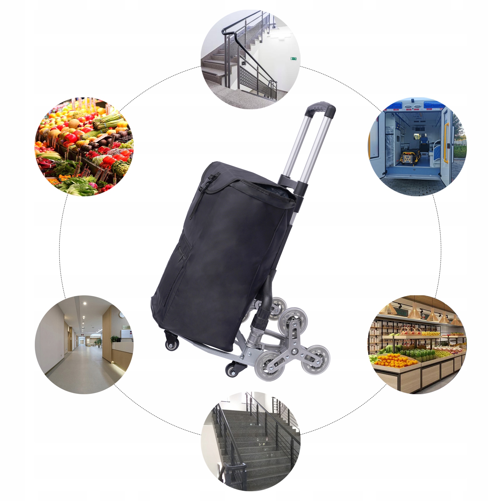 Wózek na schody, regulowana wysokość, 10 kół, nośność 75 kg, aluminium i PP