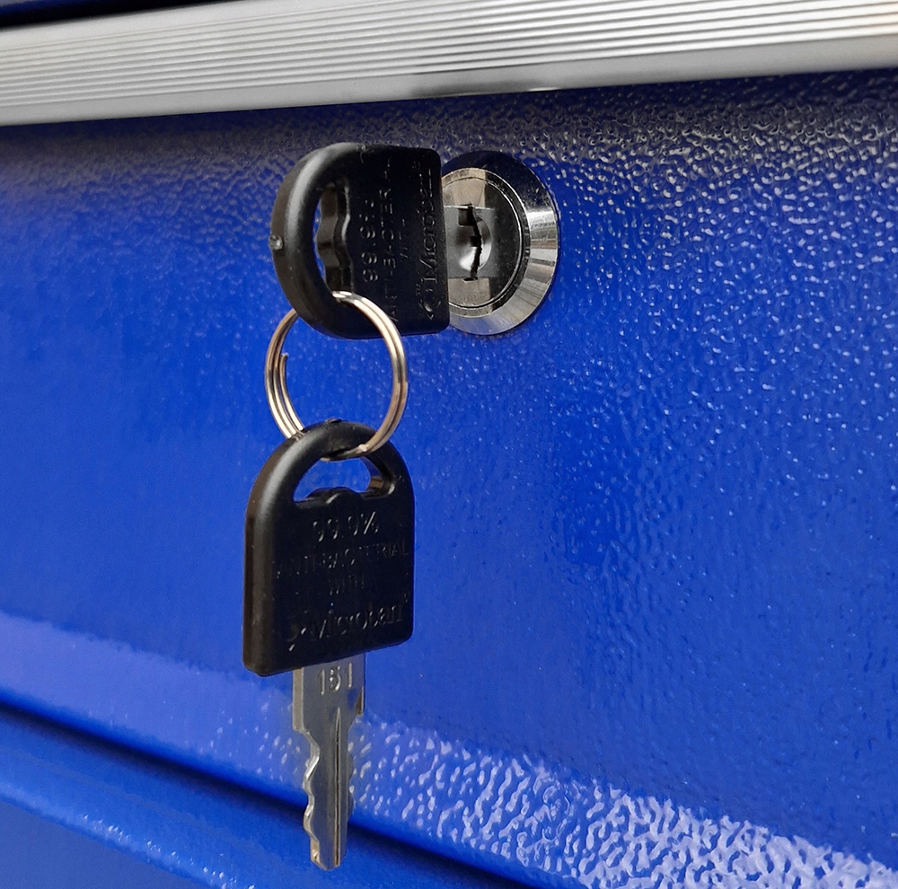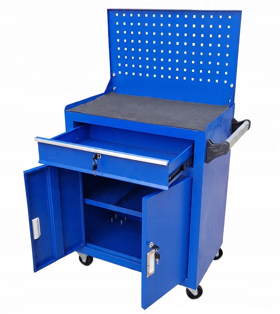 - Профессиональная тележка для мастерской включает в себя выдвижной ящик на шарикоподшипниках и двухуровневый шкаф для хранения, запирающийся с ключ.