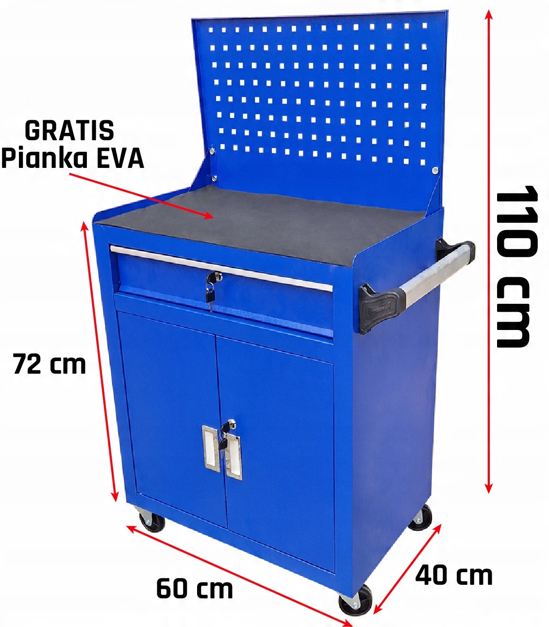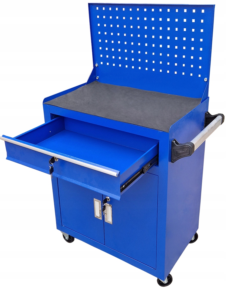 - Шкаф позволяет поддерживать порядок на работе и защищает инструменты от кражи (центральный замок). Тележка имеет эргономичную ручку, встроенную в верхнюю часть, а ящик на шарикоподшипниках полностью выдвигается. Шкаф оборудован 2 комплектами ключей от центрального замка и дополнительным шкафчиком. Коляска оснащена 4 колесами, благодаря чему ее очень легко передвигать.