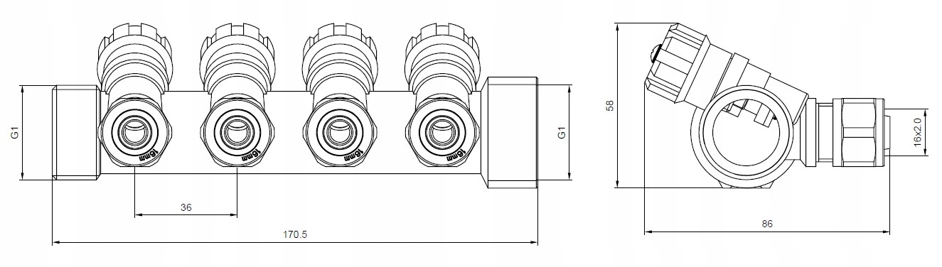 Дистрибьютор 1 "x 16x2,0 мм Pex - 6 цепей / схемы холодной воды - 6 цепей горячей воды / секции