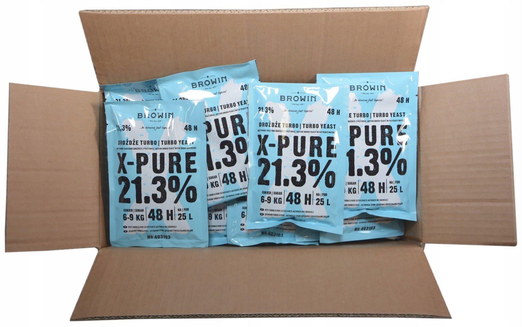 Turbo X-Pure Yeast 21,3% — инновационный продукт, содержащий смесь двух высокоспиртирующих штаммов спиртовых дрожжей, способных производить спирт крепостью до 21,3%. В пакетике содержится оригинальный состав питательных веществ и средств, регулирующих уровень pH, благодаря чему процесс происходит быстро и эффективно, а конечный продукт получается чистым и без нежелательных запахов и ароматов. Успех всего процесса обеспечивается новаторским подходом к растворению сахара. Важно добавлять сахар порциями: 7 кг + 2 кг/25 л). Это обеспечивает дрожжам мягкое начало брожения (оптимально не слишком высокое осмотическое давление – вызванное высоким содержанием сахара в растворе). Добавление второй порции сахара через 24 часа означает, что мы добавляем сахар в дрожжи в тот момент, когда клетки полностью регенерированы и часть биомассы уже размножена.