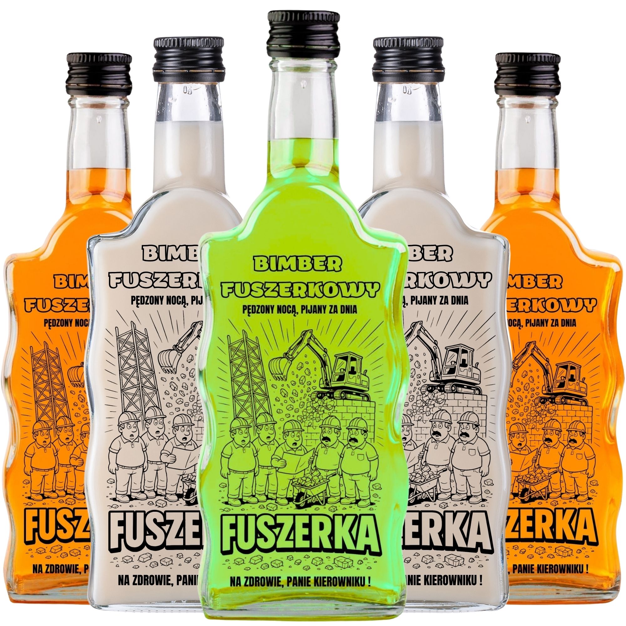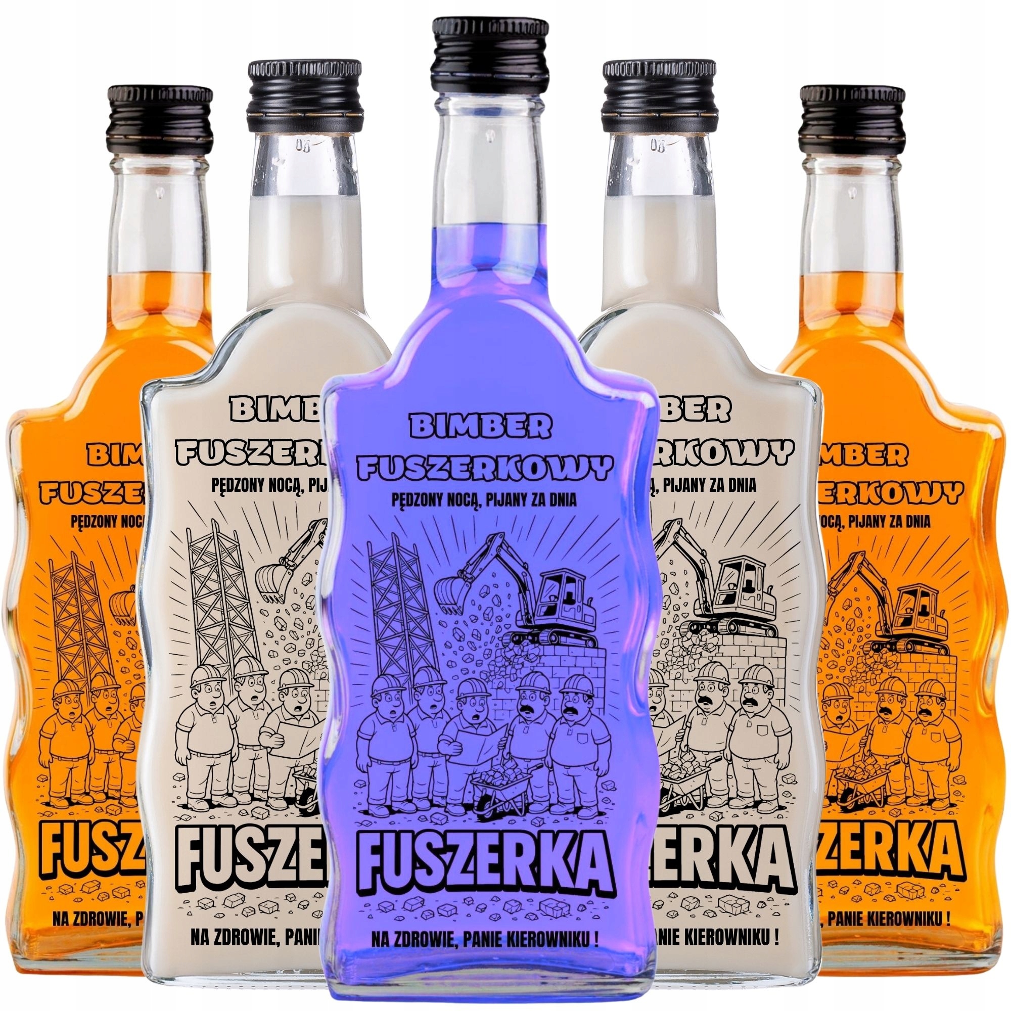 набор из 5 штук из 500 мл стеклянных бутылок с принтом "bimber fuszerka" - это предложение для всех, кто ценит юмор, твердый стеклянный стек и классические алкогольные бутылки. В наборе каждая бутылка имеет черную крышку , а отпечаток, изготовленный из постоянной традиционной печати, не втирает и не промывает.