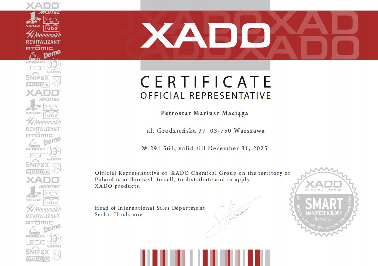 Химическое беспокойство Xado была основана в 1991 году, специализируясь на разработке и реализации современных технологий для экономии энергетических носителей и энергии. Он включает в себя научный и исследовательский центр «Laboratories», со специализированными физико-химическими, химическими, трибологическими и баллистическими лабораториями.