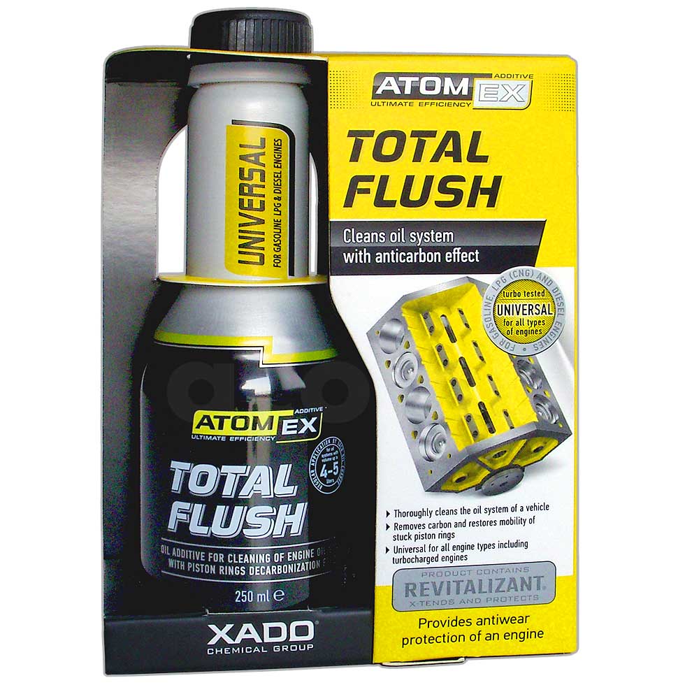 AtomEX Total Flush — продукт эффективной и комплексной работы в системе смазки двигателя. Ревитализант® и уникальное сочетание оригинальных моющих и диспергирующих ингредиентов обеспечивают очистку системы смазки перед заменой масла до уровня технической чистоты. Освобождают заклинившие поршневые кольца и создают защитный резерв от фрикционного износа рабочих частей.