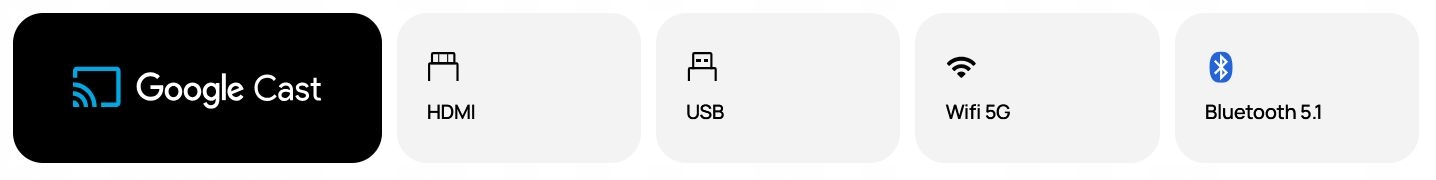 Mogo 4 Laser предлагает ряд вариантов соединений: Google Capt, Wi-Fi, Bluetooth 5.1, HDMI, USB -который позволяет быстро подключить консоли, ноутбук, игрока Blu-ray или внешний диск. Набор также включает в себя четыре креативных фильтра с несколькими режимами отображения: закат, лунный, волновой и мечтательный пейзаж.