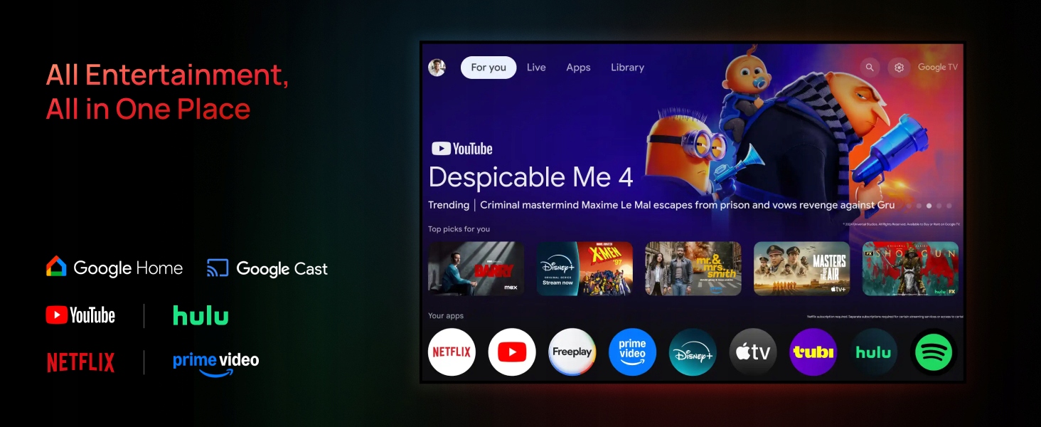 ПлатформаGoogle TV предоставляет пользователю доступ к множеству приложений через Google Play Store, включая различные онлайн-сервисы видео по запросу, такие как Netflix, YouTube и Amazon Prime Video. Просто установите нужное программное обеспечение, а затем войдите в учетную запись пользователя выбранного VOD-сервиса, чтобы получить доступ к большому списку фильмов, сериалов и телепрограмм. Благодаря совместимости с Google Cast можно передавать контент со смартфонов Apple и Android по беспроводной сети. Пульт дистанционного управления, совместимый с Google Assistant, позволяет дополнительно управлять проектором с помощью голосовых команд — от поиска контента до запуска приложений.