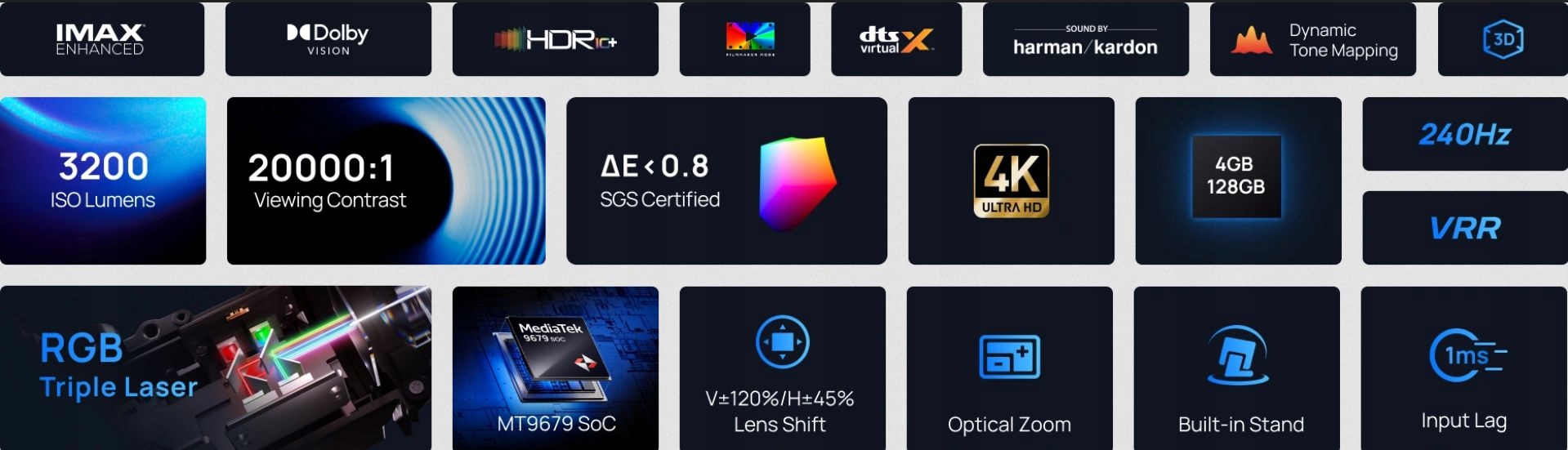 Яркость устройства составляет до 3200 люмен ISO в сочетании с высокой контрастностью 10 000:1, что гарантирует четкое насыщенное изображение даже при дневном свете. Сертифицированная SGS технология X-Master RGB Triple Laser минимизирует излучение синего света, при этом точно воспроизводя цвета в соответствии с четырьмя основными стандартами цветового пространства (BT.2020, Rec.709, DCI-P3, Adobe RGB) с параметром Delta E <0,8. Благодаря этому каждая деталь – даже в темных сценах – воспроизводится с исключительной точностью. Проектор сертифицирован IMAX Enhanced, что переносит зрителя в мир кино благодаря сверхширокому формату изображения 1,9:1 — до 26 % больше, чем стандартное соотношение сторон. Поддержка HDR10+, Dolby Vision с 12-битной глубиной цвета и режима Filmmaker означает, что материалы могут отображаться именно так, как задумали их создатели. Реалистичные цвета и детализация изображения позволяют Horizon 20 вызывать кинематографические эмоции при каждом просмотре.