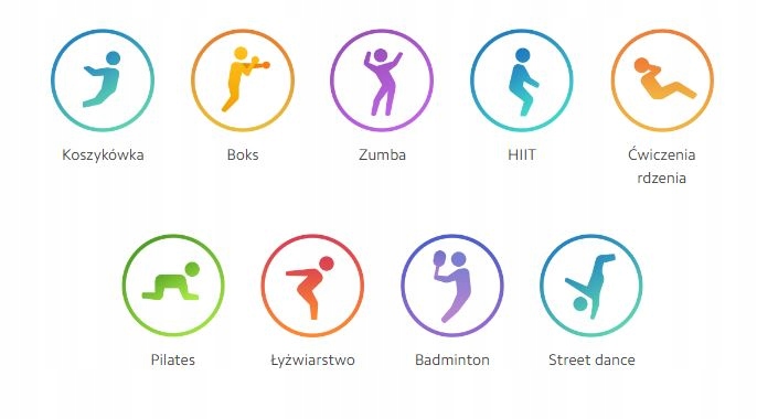 - Тренировки: беговая дорожка, фристайл, бег по пересеченной местности, езда на велосипеде, ходьба, бассейн, гребля, эллиптический тренажер, велотренажер, йога, скакалка, сила, растяжка, бокс, степпер, кикбоксинг