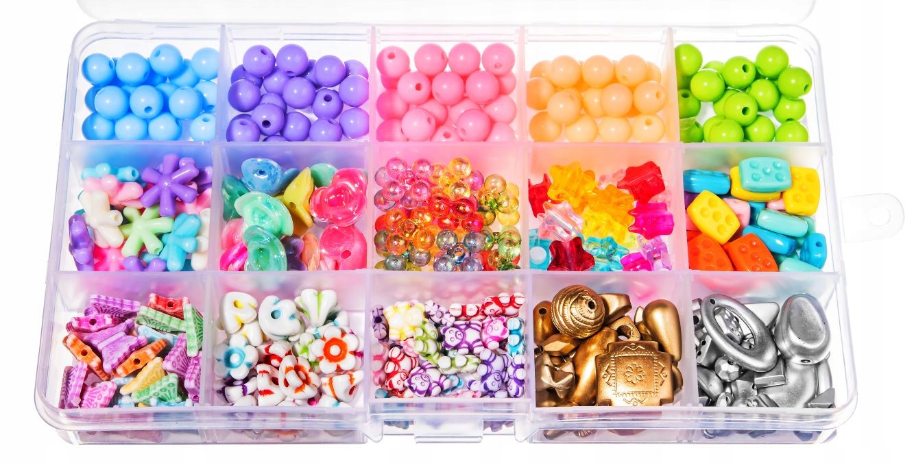 Бусины разных форм и размеров рассортированы в органайзере размером 17/10 см. Всего по 20 бусин каждого цвета (10 пар). Всего 180 привлекательных элементов. Они изготовлены в основном из акрила и небольшого количества стекла.