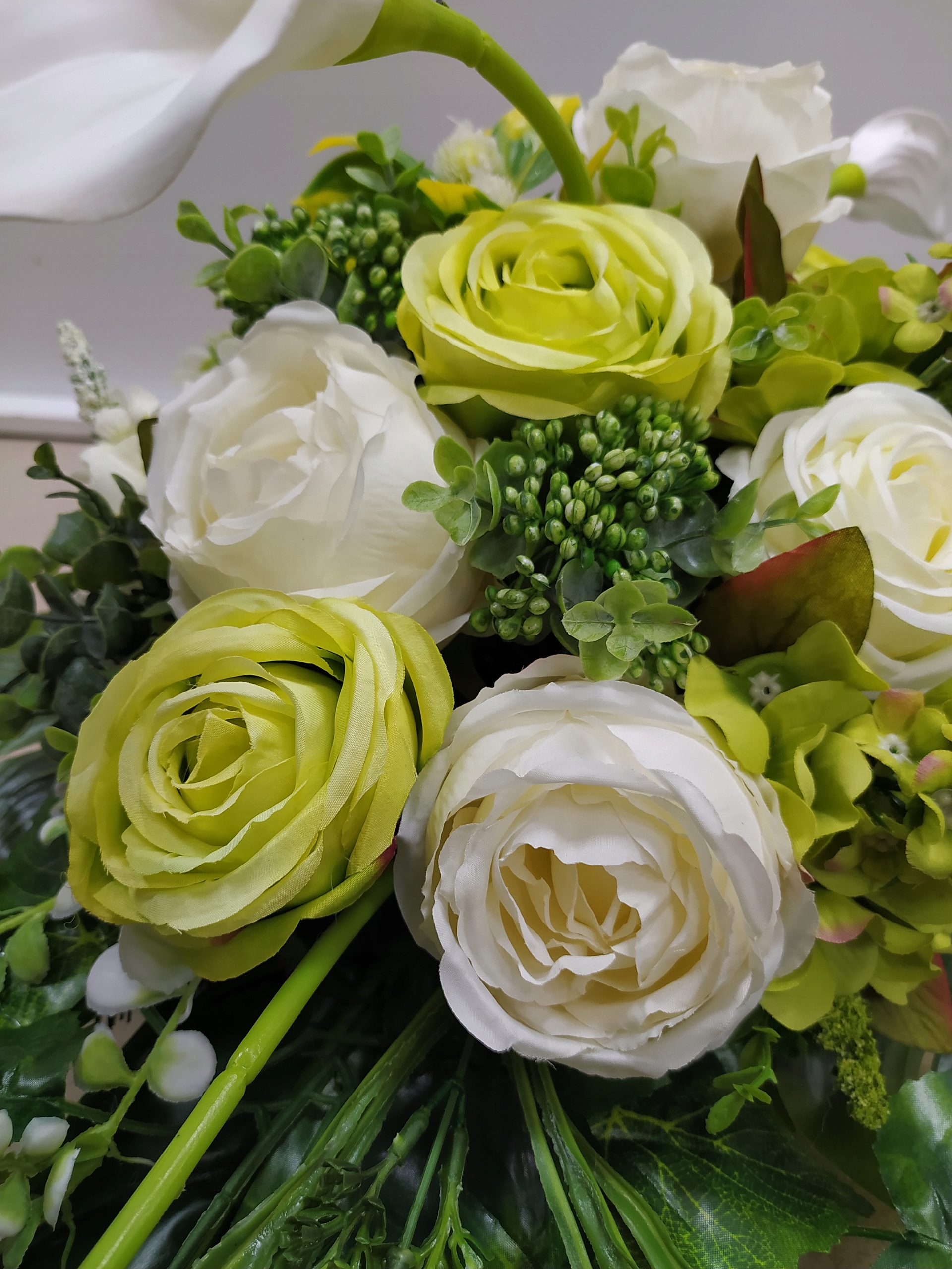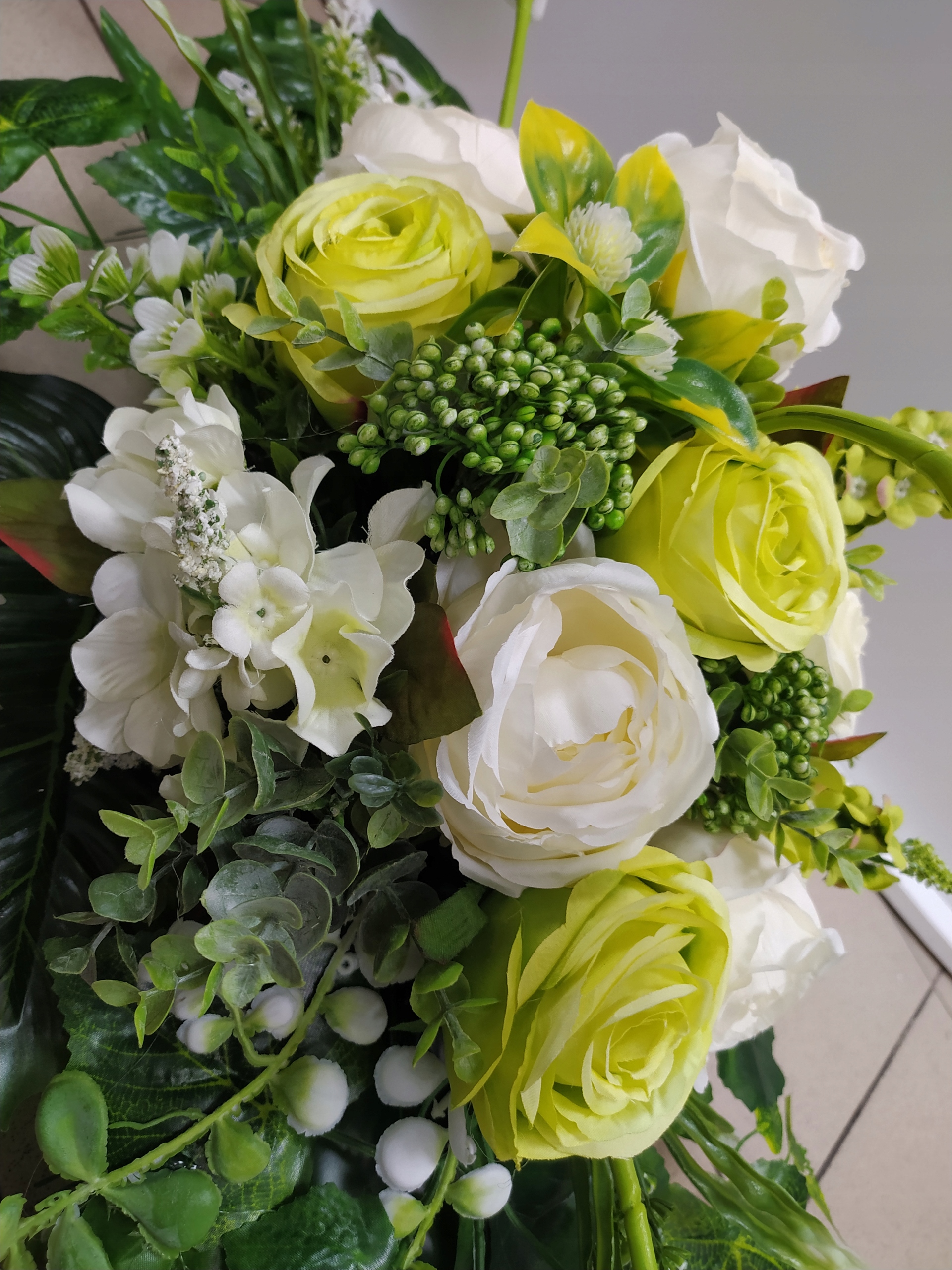 Цветы качественные, композиции утяжелены, что делает их устойчивыми на могиле. Размер и цвет могут незначительно отличаться в зависимости от того, как мы оформляем украшение, и настроек вашего монитора.