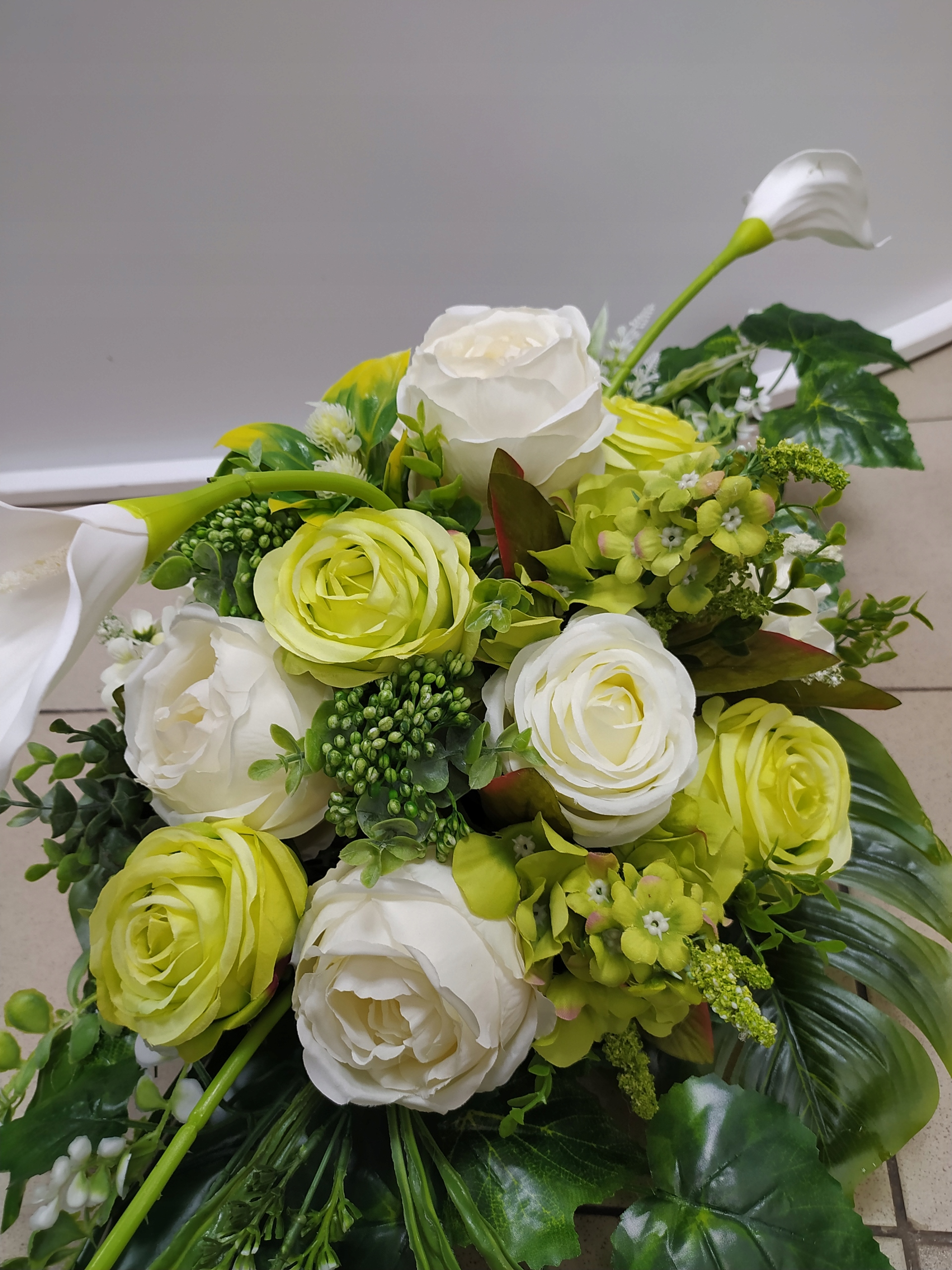 Красивое могильное украшение продолговатой формы из искусственных цветов, композиция на тарелке. Мы сами тщательно составляем наши композиции, благодаря чему трости уникальны и в жизни выглядят еще лучше.