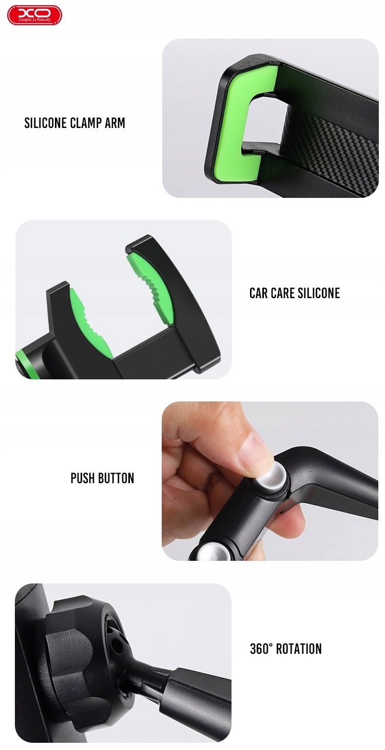 Держатель XO — решение для автомобиля, дома или офиса, позволяющее удобно разместить мобильное устройство. Благодаря прочной ручке устройство хорошо удерживается, а винтовой зажим обеспечивает надежный захват зеркала, столешницы, письменного стола, стола и т. д. Два регулируемых шарнира и вращающаяся на 360 градусов головка позволяют отрегулировать ручку под индивидуальные предпочтения пользователя. Дополнительно в держателе имеются силиконовые вставки, предотвращающие появление царапин как на крепежном элементе, так и на устройстве.