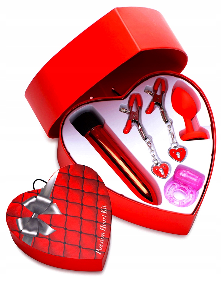 Подарите себе и любимому человеку этот набор увлечений! Все, что вам нужно для ночи страсти, включено в эту коробку в форме сердца: зажимы для сосков в форме сердца с утяжелителями, мощный многоскоростной вибратор, жужжащее кольцо для члена и силиконовая анальная пробка ждут вас и вашего любовника для изучения. и исследуйте...