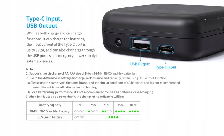 Зарядное устройство Xtar BC4 также можно использовать в качестве аккумулятора. Он имеет USB-выход 5 В 2 А, который позволяет экстренно заряжать любое устройство, например смартфон, MP-плеер и т. д. Емкость повербанка зависит от размещенных в нем аккумуляторов. Важно отметить, что функцию выхода USB можно использовать даже при использовании щелочных батарей. Однако рекомендуется использовать Ni-MH/Li-ion аккумуляторы напряжением 1,5 В.