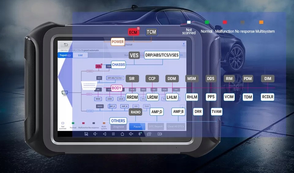 Интеллектуальный диагностический инструмент xtool D9HD оснащен модулем топологии для сканирования всех доступных автомобильных модулей и показывает состояние диагноза, отмеченное цветами в картировании деревьев, который показывает базовые коммуникационные структуры между модулями.