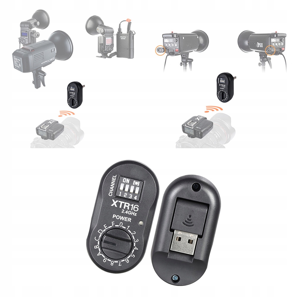 1. XTR-16 USB Connectors Беспроводная вспышка управления питанием. Он может быть совместимы с передатчиком серии TTL беспроводного триггера X1, чтобы сделать флэш -триггер.