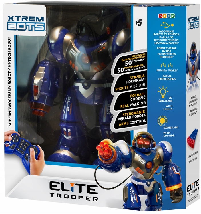 Elite Trooper Bot — великолепная радиоуправляемая игрушка. Направьте пистолет и стреляйте в цель! Управляйте руками робота и выполняйте одно из 50 программируемых действий!