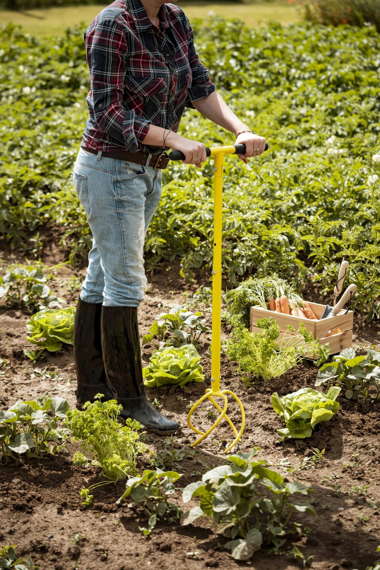 Инструмент также безопасен в использовании, поскольку он одним движением втыкается в землю, а при повороте можно выдергивать сорняки или рыхлить почву. Ручка покрыта ПВХ, благодаря чему не скользит во время использования. Благотворно влияет на суставы и мышцы, поскольку не вынуждает принимать неестественное положение при копании.