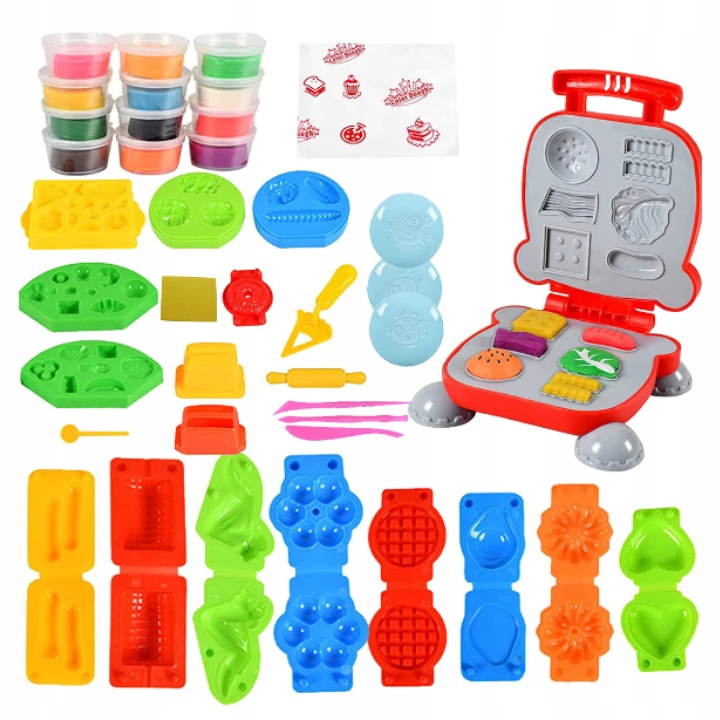 Этот красочный роскошный набор — отличная идея для подарка. Содержит 12 разноцветных тортов, 16 форм для штамповки, машинку для гамбургеров, 5 дополнительных инструментов, 4 тарелки и водонепроницаемый коврик. Полный комплект обеспечивает много часов бесконечного веселья без необходимости покупать дополнительные элементы.