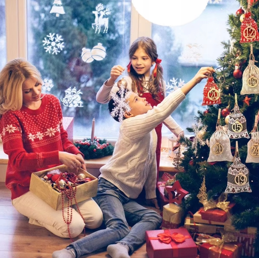 В комплект рождественского льняного мешочка входят 24 подарочных пакета с веревкой и холстом, 24 деревянных колышка и пронумерованные рождественские наклейки. Конструкция с шнурком позволяет легко открывать и закрывать подарочный пакет и предотвращает потерю предметов.