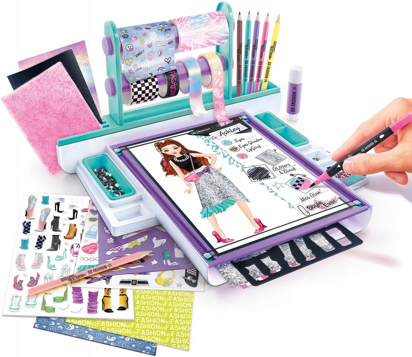 Представьте свою собственную коллекцию модной одежды в этой студии «все включено»! Вырезайте, склеивайте, рисуйте, раскрашивайте, чтобы создать огромное количество гипермодных нарядов! Настоящие тканевые доски и множество аксессуаров в наборе позволят вам создавать образы настоящего стилиста! Идеальный подарок для всех маленьких творческих людей!