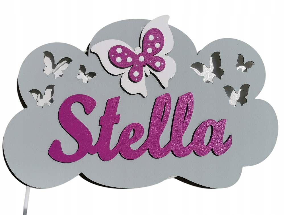Светильник имеет вырезанные ажурные элементы в виде звездочек. и бабочки. Дополнительно на каждое облако мы размещаем надпись с именем вашего ребенка и один декор размером 10 см на выбор: бабочка, сова, мишка, трактор