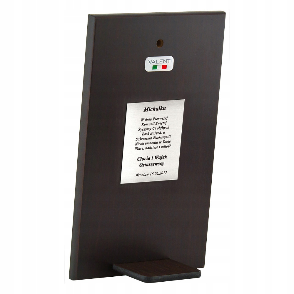 Таинство Первого Причастия, как важное духовное событие, отмечаемое в семье, несомненно, останется в памяти ребенка на долгие годы. Торжественную атмосферу этого особенного дня отражает точно сделанная картина, на которой изображен сосредоточенный молящийся мальчик. Его фигура, помещенная на матовом фоне, красиво контрастирует с блестящей святой чашей и воинством, подчеркивая духовное измерение сцены. Изготовленное из серебра высочайшего качества 925 пробы и высококачественного металла, оно гарантирует безупречный блеск, а защитный слой лака предотвращает потускнение серебра на долгие годы. Это делает картину вечным сувениром о Святом Причастии, напоминающим нам о принятии в сердце тела и крови Христовой. Обратная сторона картины отделана темным орехом, матовым деревом. Картина имеет универсальное крепление, благодаря которому всю вещь можно не только поставить на полку, но и повесить на стену.