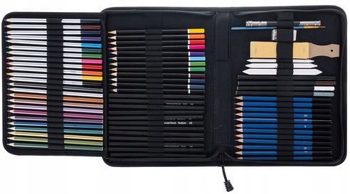 - ЧЕХОЛ В КОМПЛЕКТЕ – весь набор заключен в элегантный тканевый футляр. Черный цвет подойдет как женщинам, мужчинам, девочкам и мальчикам. Благодаря защитным резинкам у каждого изделия есть свое место, поэтому их легко хранить и переносить. Дополнительно оснащен одним складным вкладышем для таких аксессуаров, как мелки, карандаши, уголь и т. д. Вся вещь застегивается на молнию и имеет вешалку