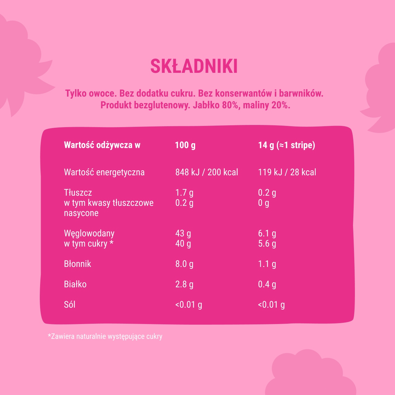 - Чистый состав. Стрипы имеют 100% натуральный состав. Это просто фрукты и ничего больше! Они всегда изготавливаются без добавления сахара, консервантов и красителей. Они не содержат глютена и ГМО.