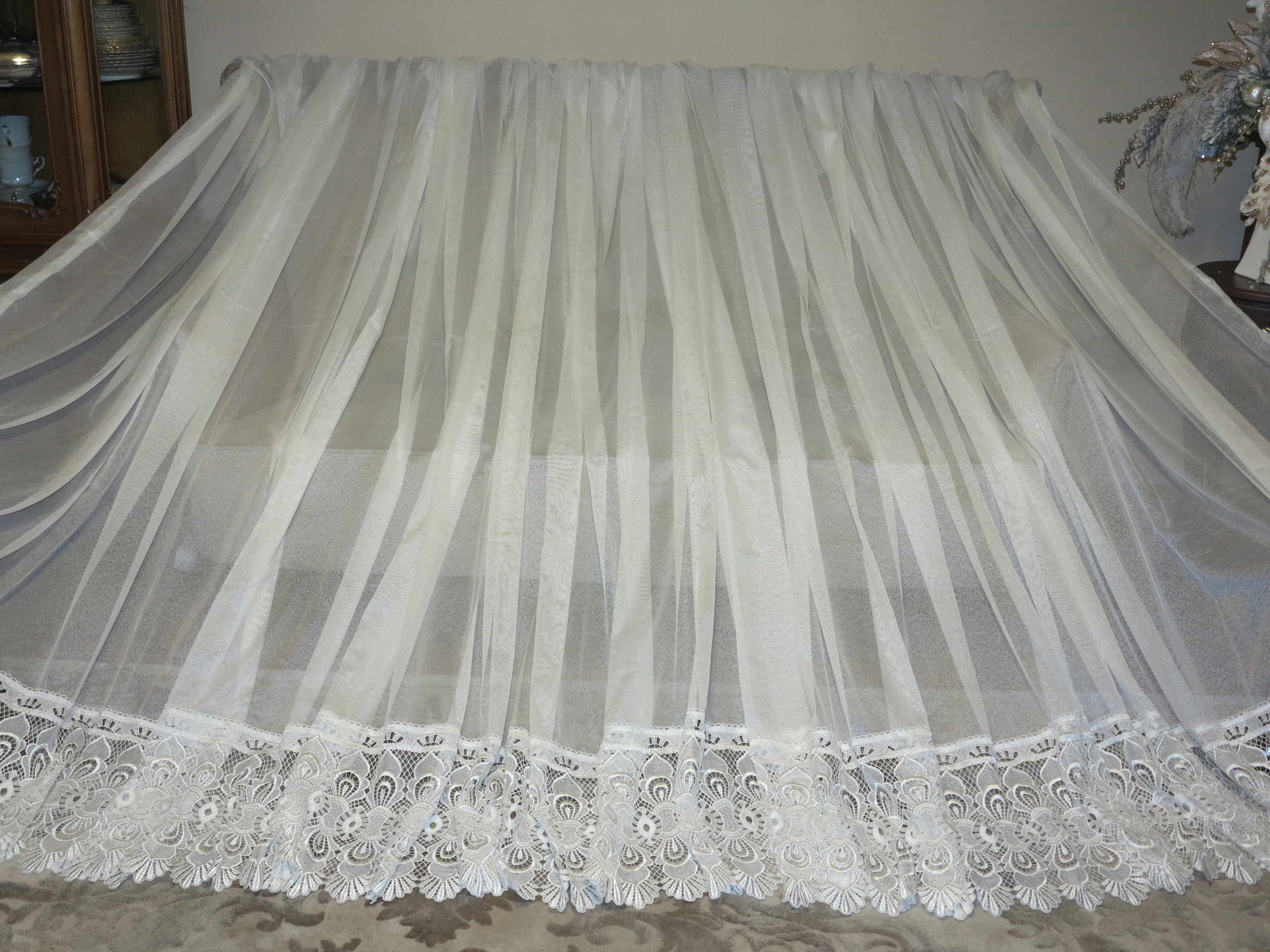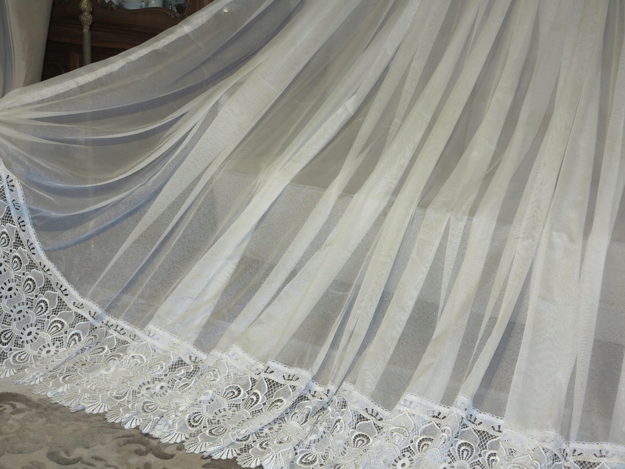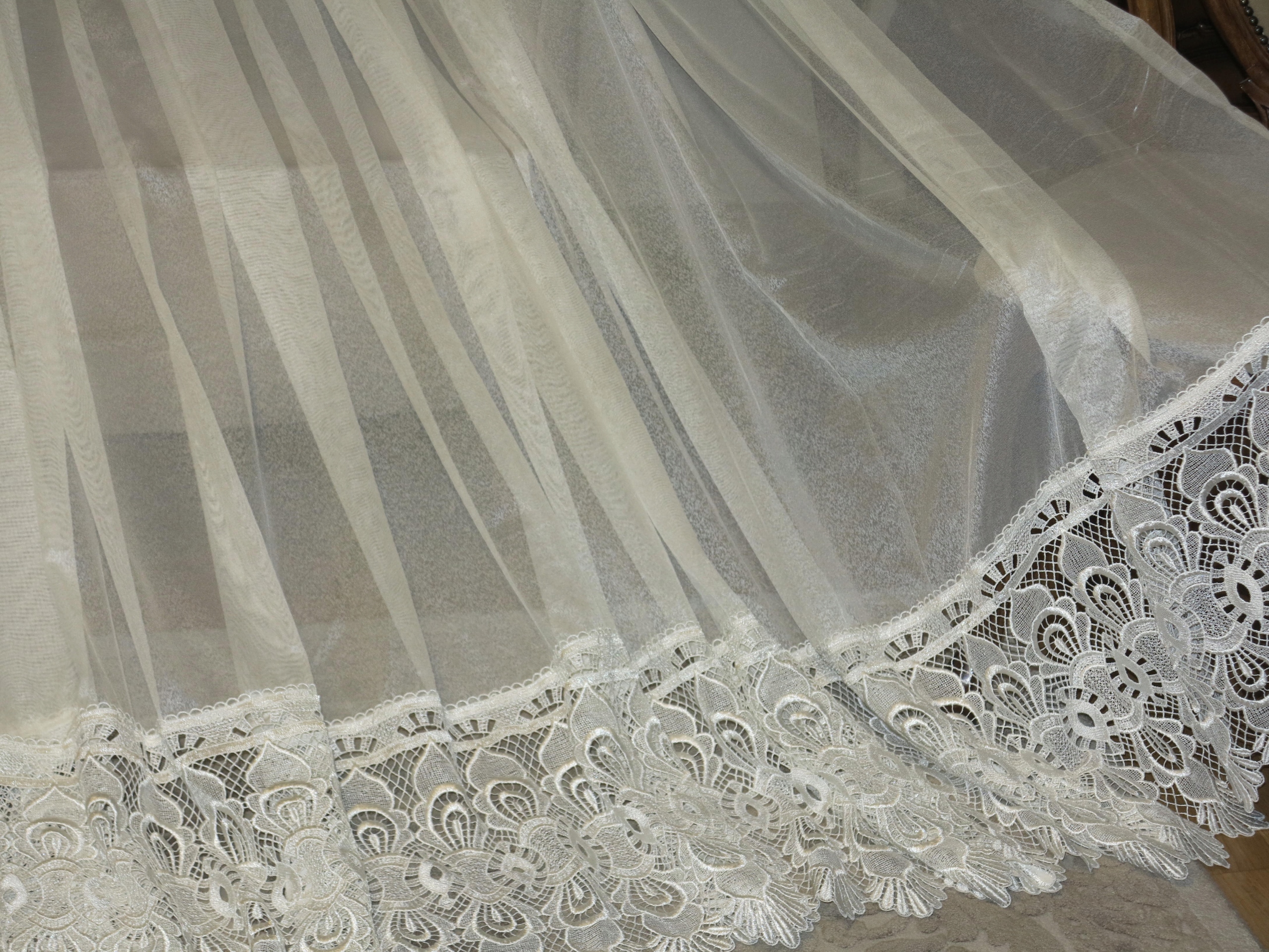 Предмет аукциона – необыкновенно красивая гардина с гипюром внизу, цвета экрю, очень нежная на вид. В реальности занавеска еще красивее. Штора б/у, в отличном состоянии и качестве, новая, без бирок. Рекомендую.