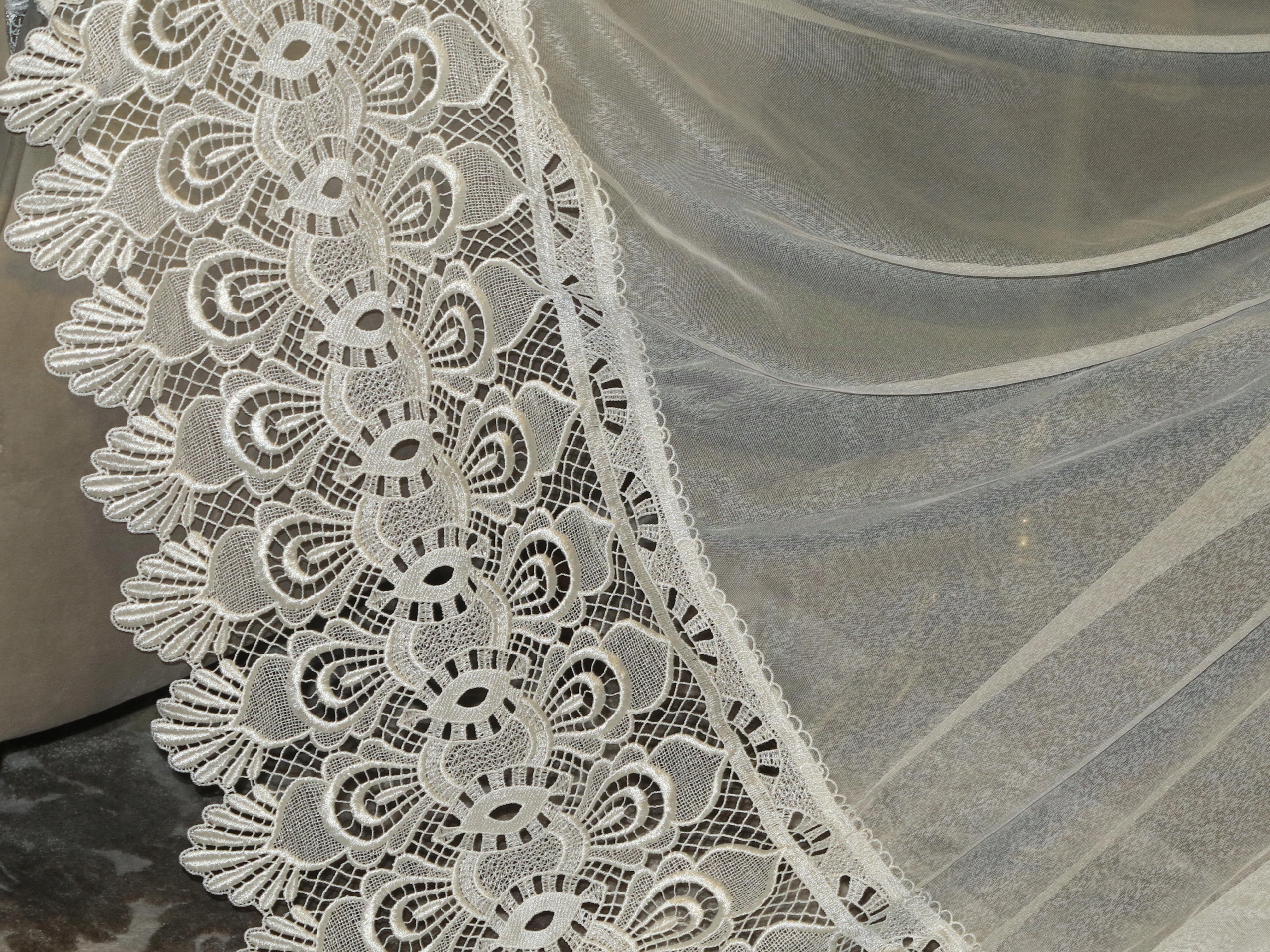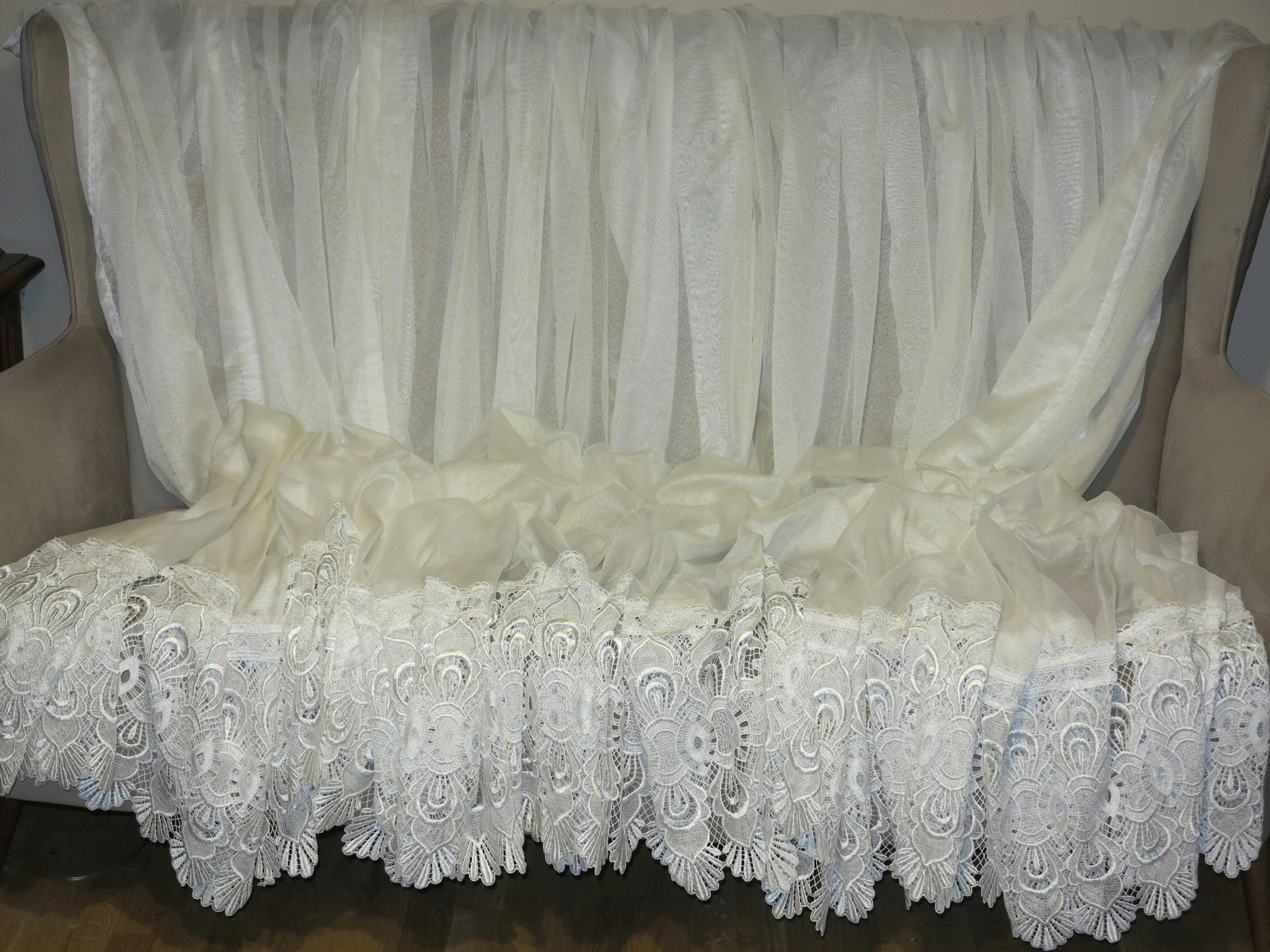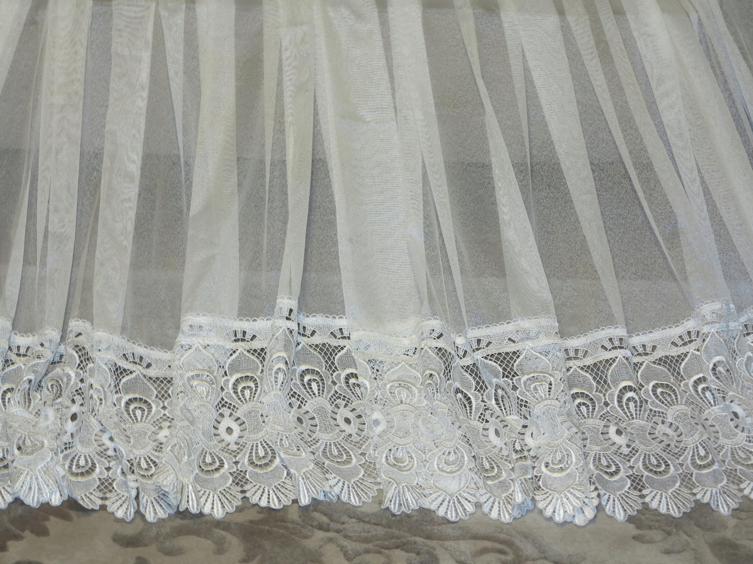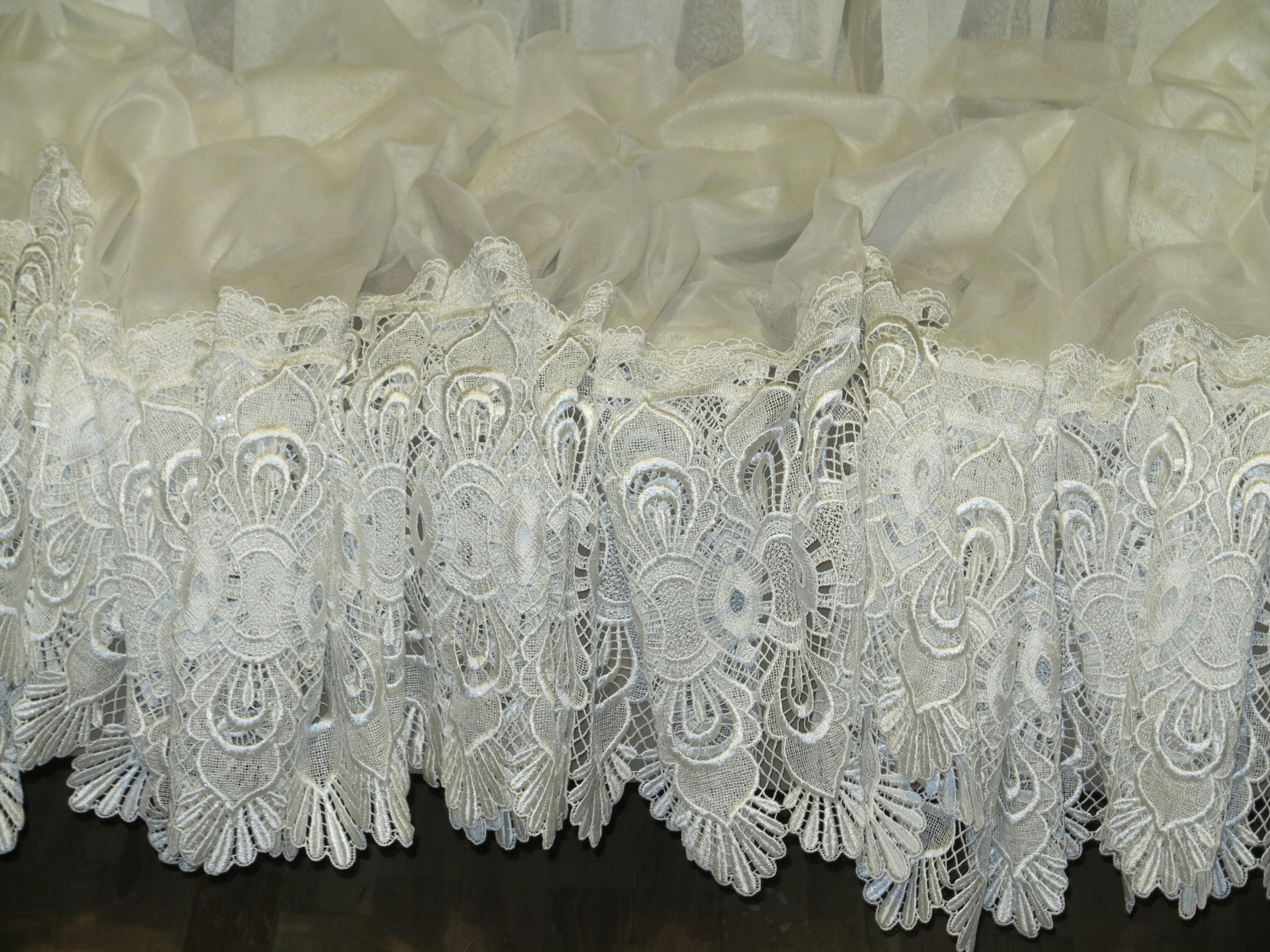 Предмет аукциона – необыкновенно красивая гардина с гипюром внизу, цвета экрю, очень нежная на вид. В реальности занавеска еще красивее. Штора б/у, в отличном состоянии и качестве, новая, без бирок. Рекомендую.