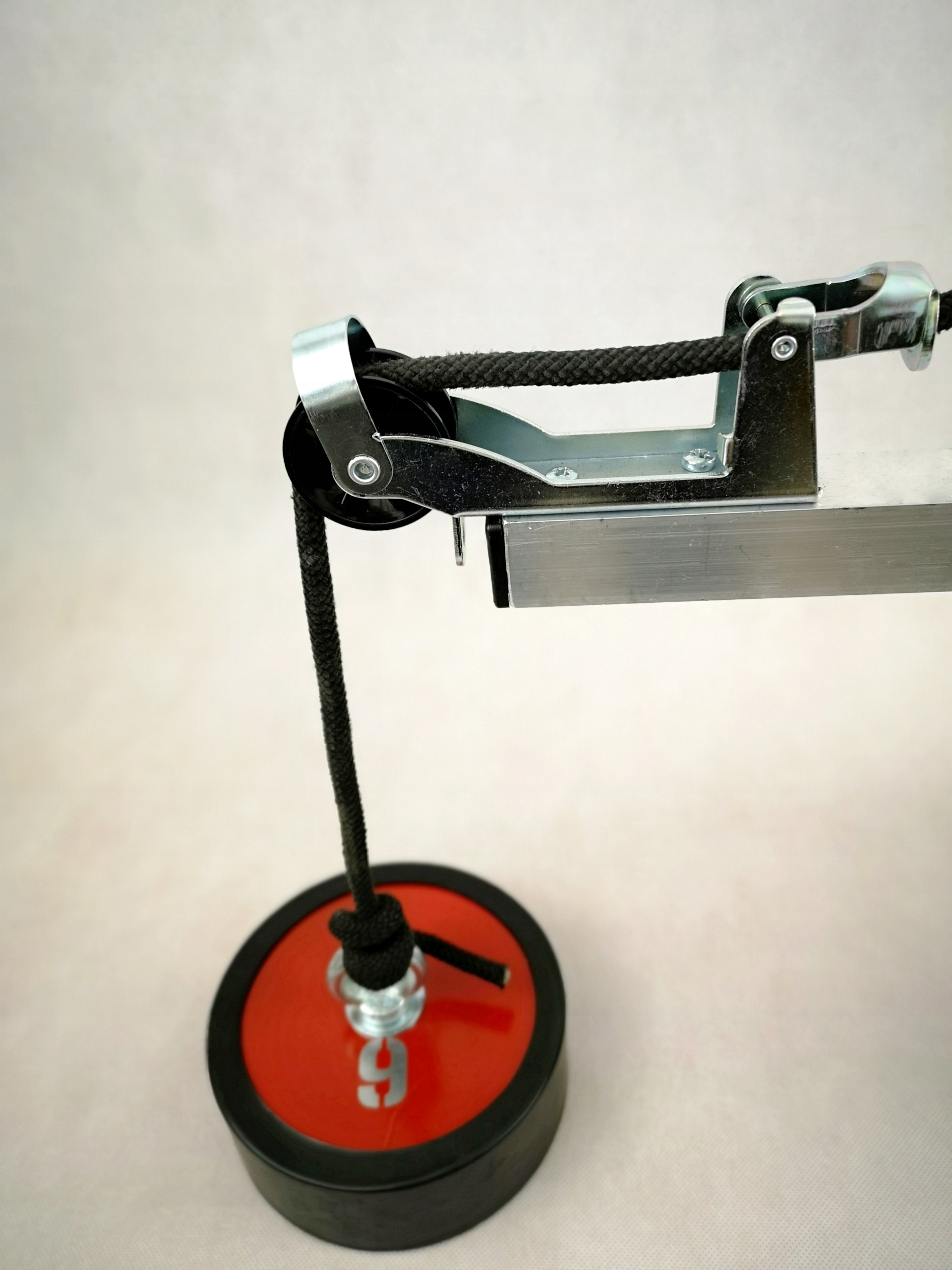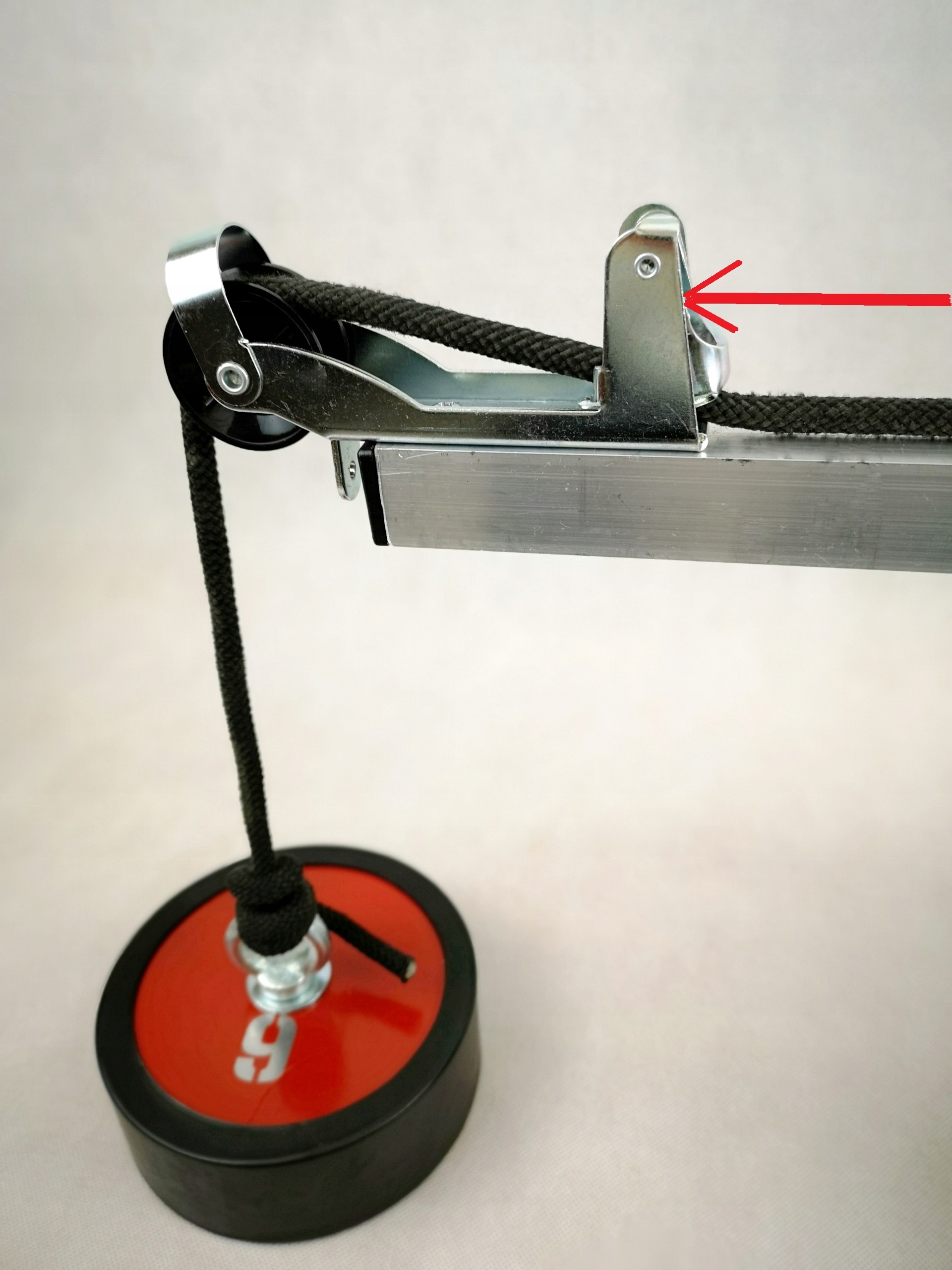 Направляющая/анкерный ролик с веревочным замком. Запорный механизм из оцинкованной стали. Оставшаяся часть изготовлена из легкого и прочного алюминиевого профиля 30х30х2мм.