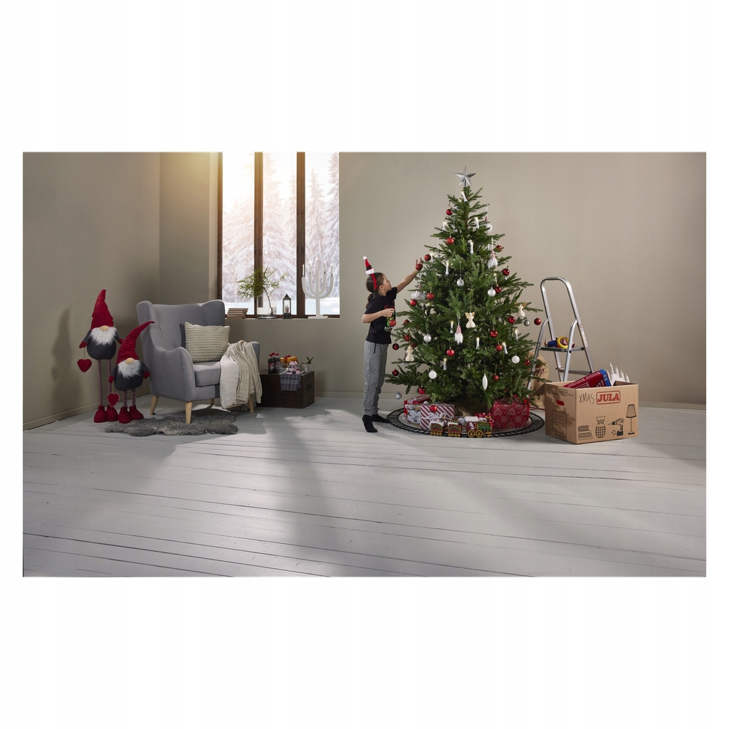 Рождественская елка имеет в общей сложности 2640 веток, некоторые из которых сделаны из полиэтилена (1863 ветки), а некоторые из ПВХ (778 веток). Подставка для елки в комплекте.