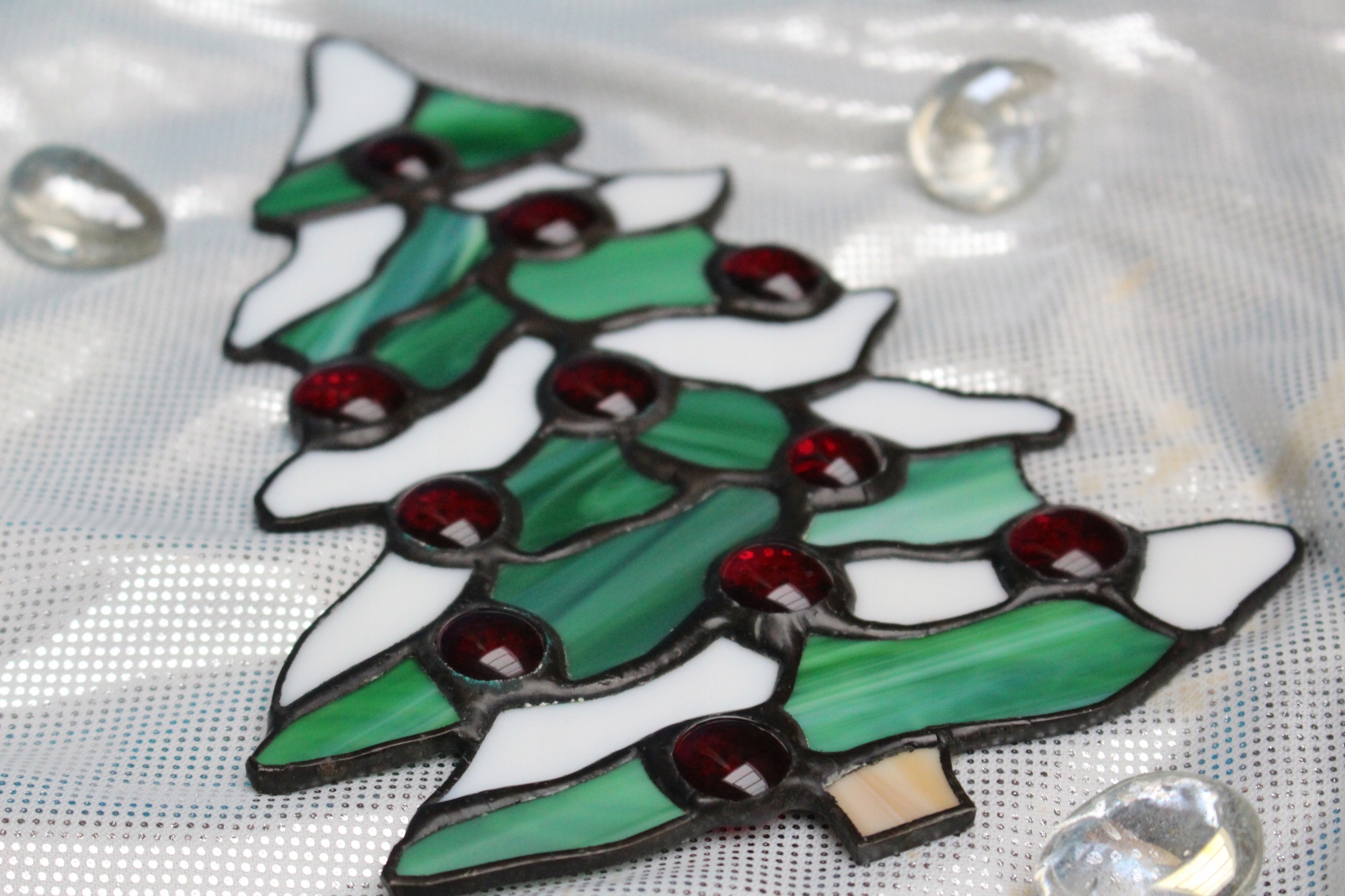 Рождественская елка и красные витражные игрушки, которые можно повесить