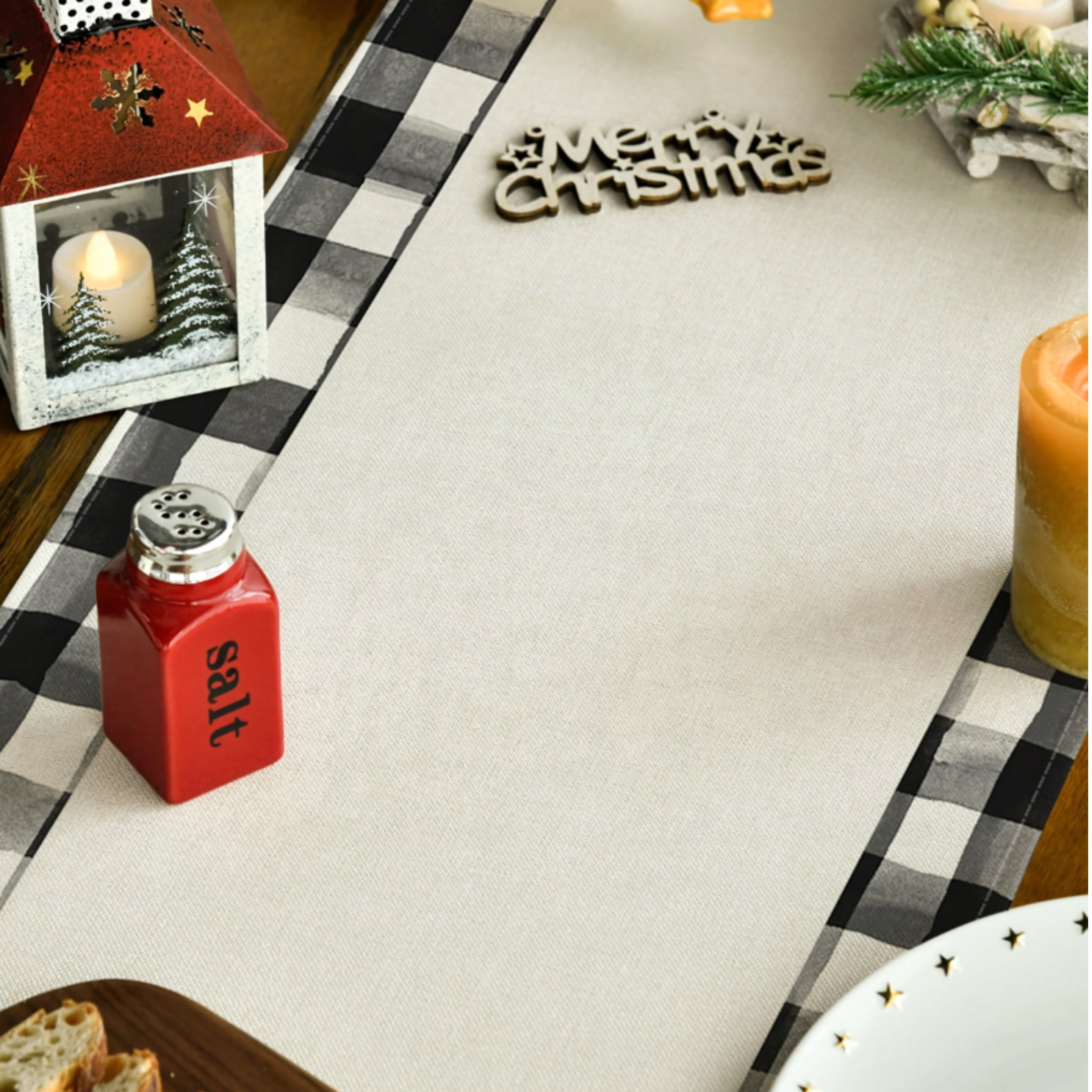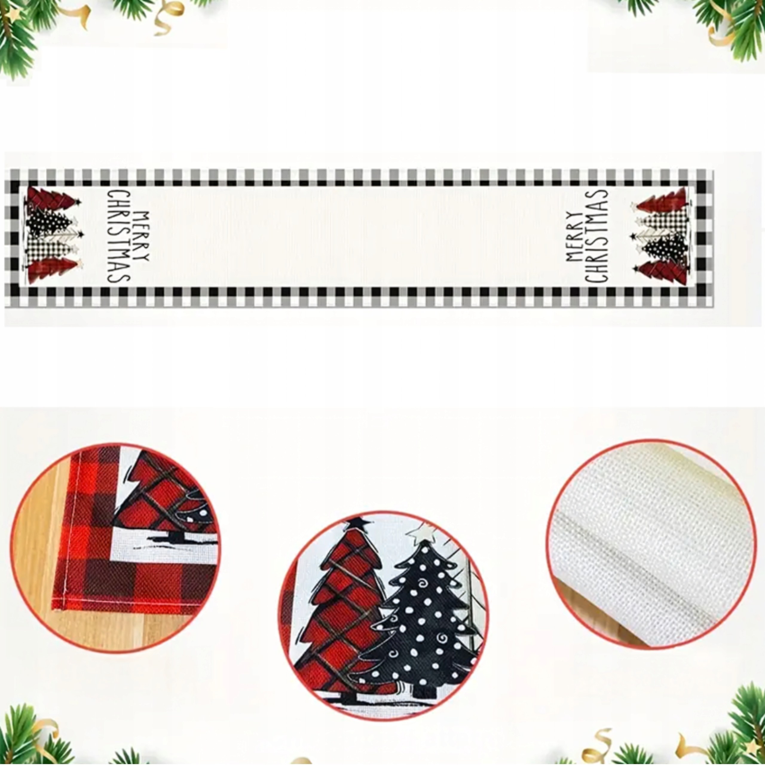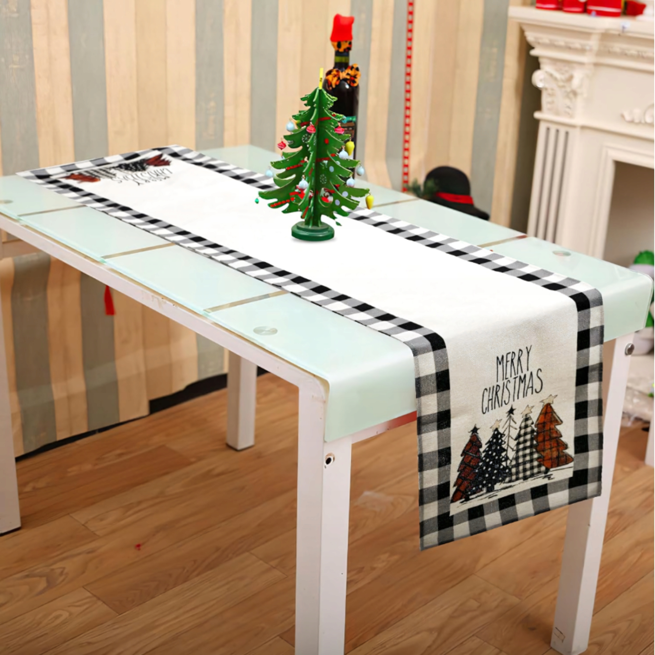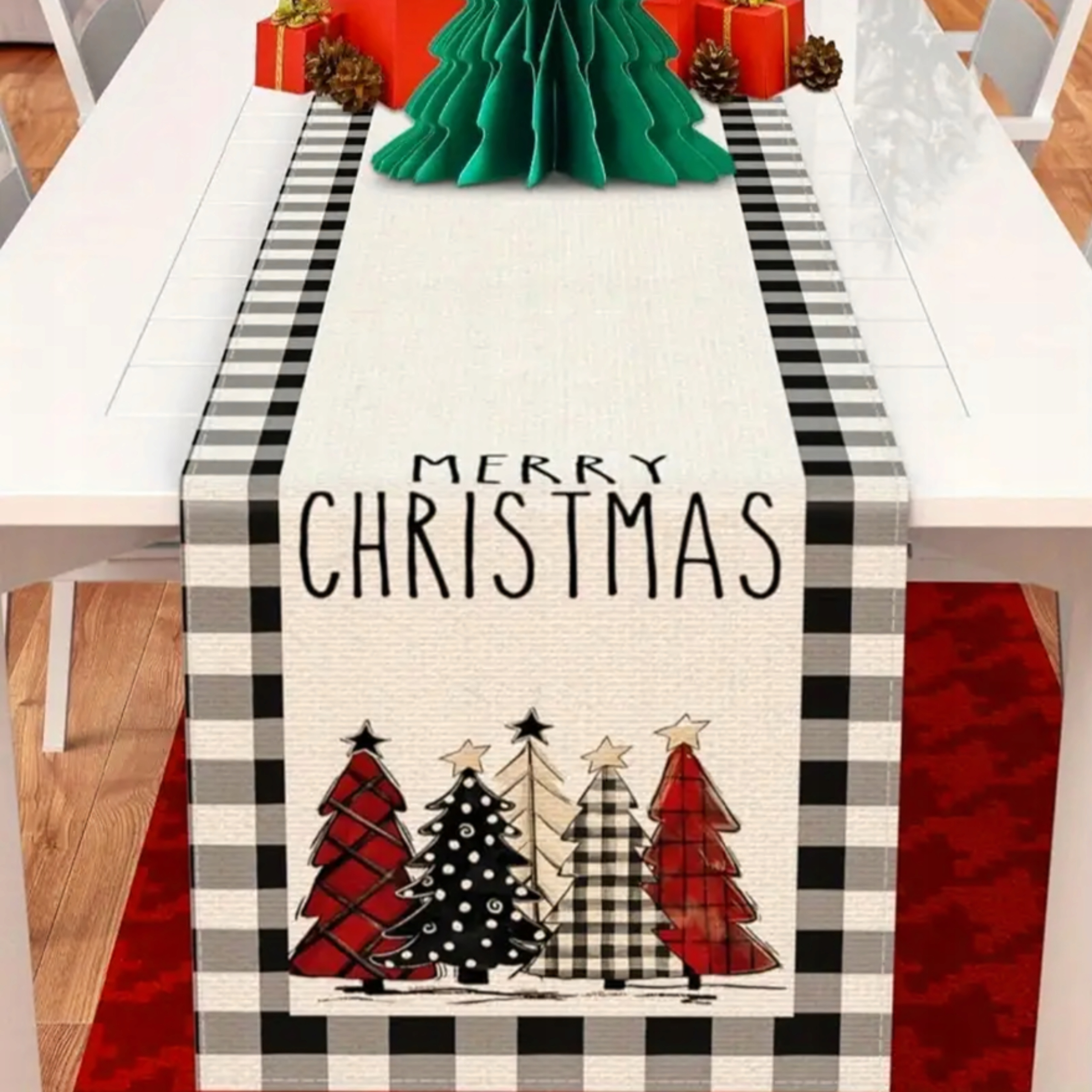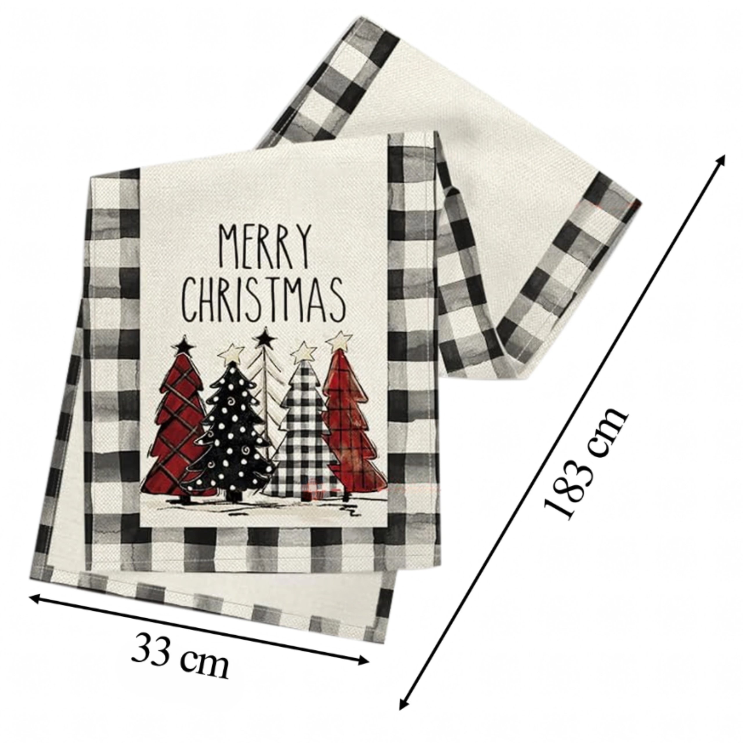 ✨Рождественская дорожка для стола 183х33 см с элегантным черно-белым клетчатым узором с разноцветными елочками и надписью Merry Christmas - прекрасное украшение стола к Рождеству.