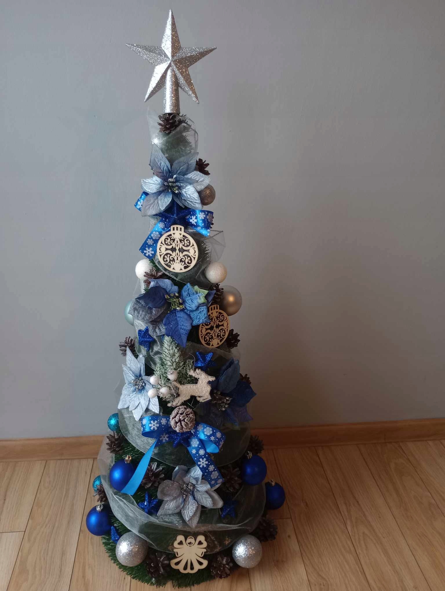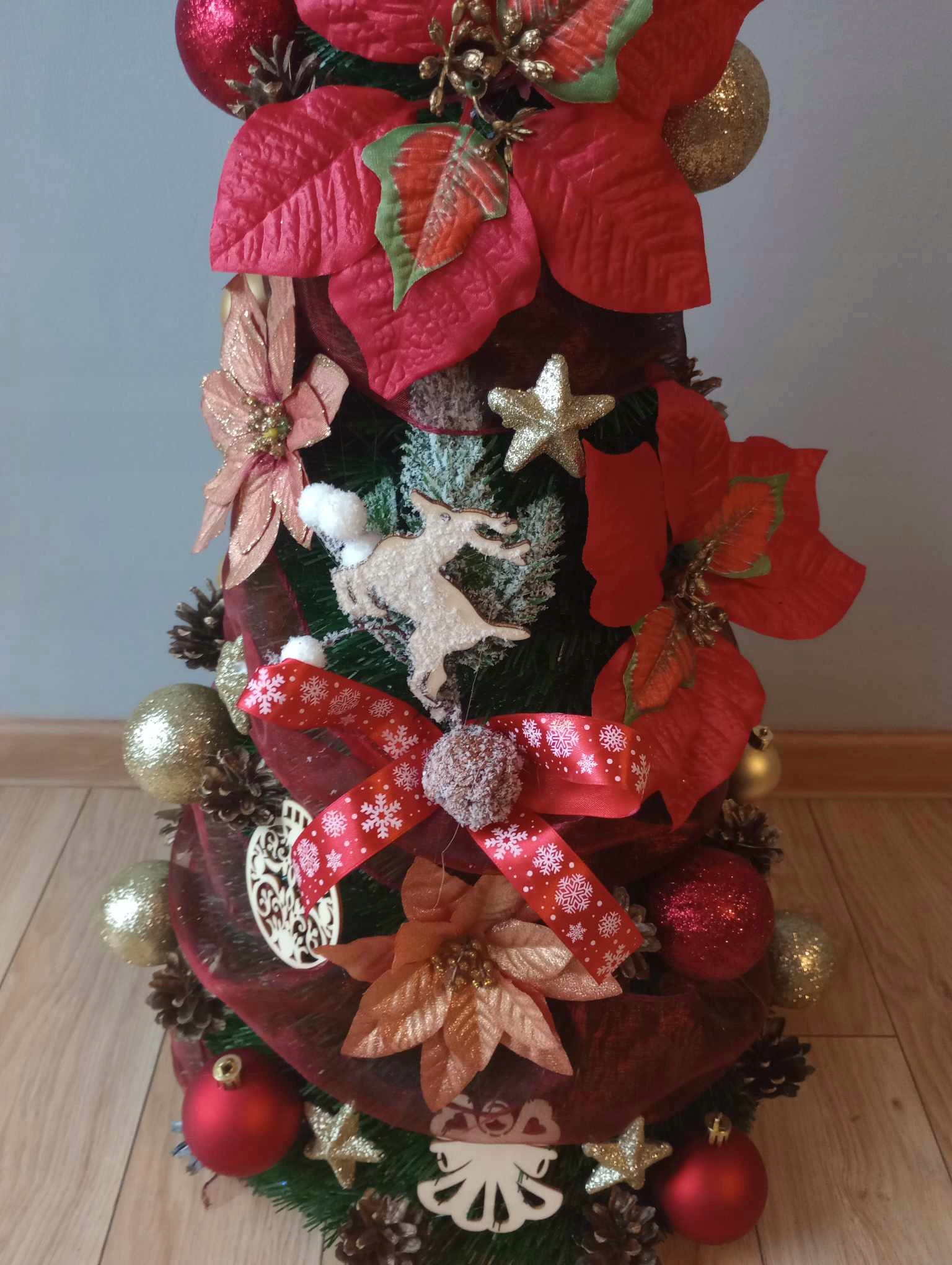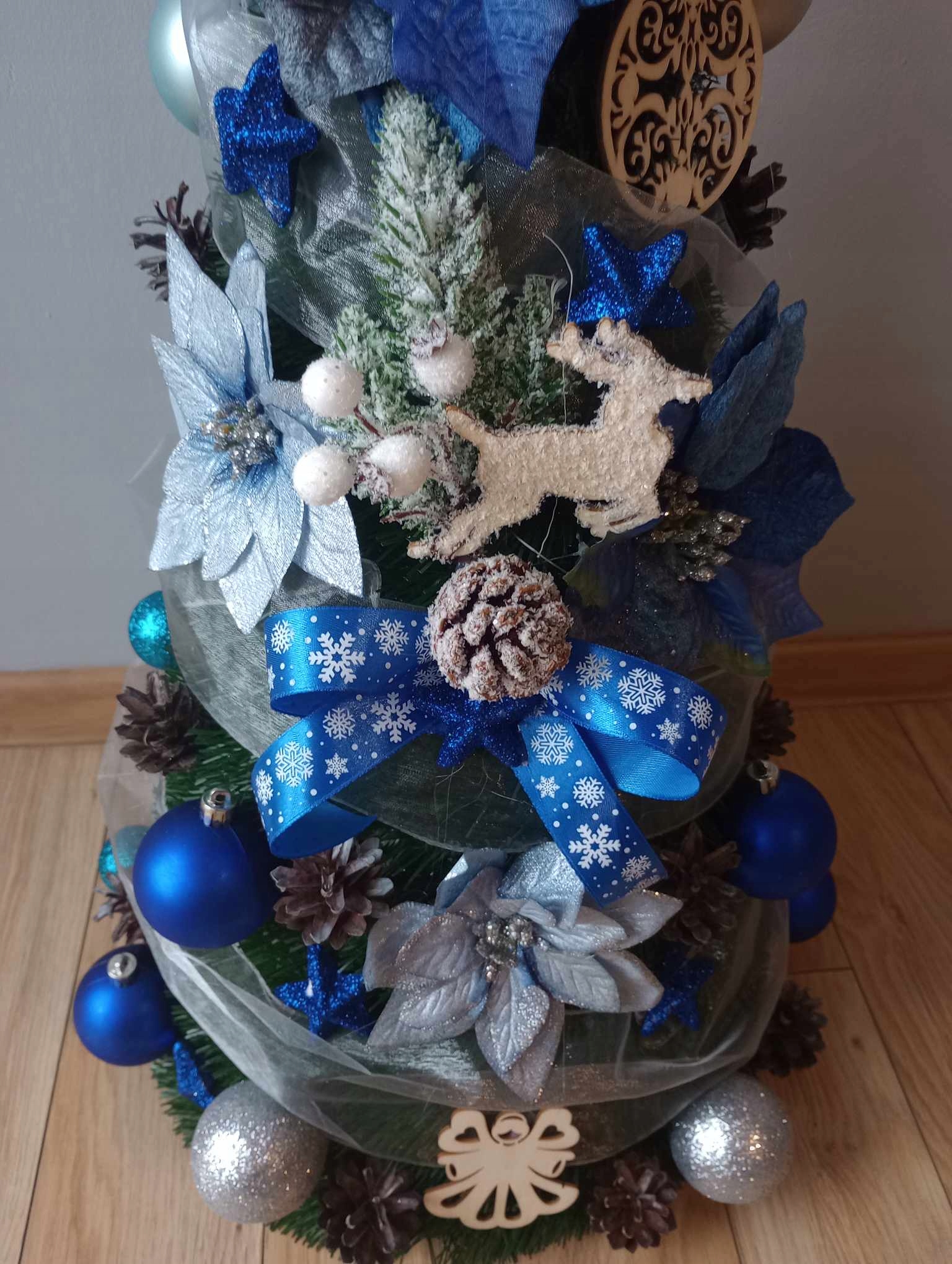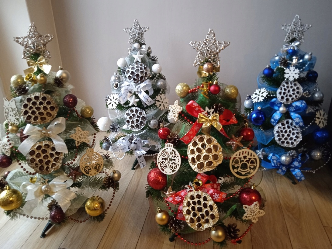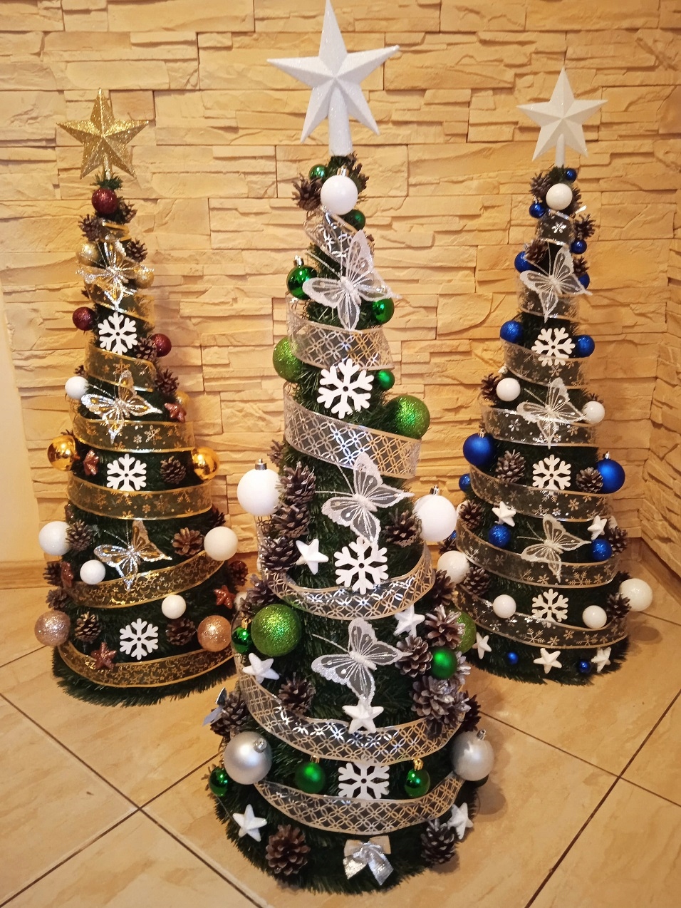 Мы изготавливаем елки с украшениями следующих цветов: серебряный, белый, золотой, синий, красный, коричневый, зеленый, фиолетовый или смешанный, например золотой. и красный.