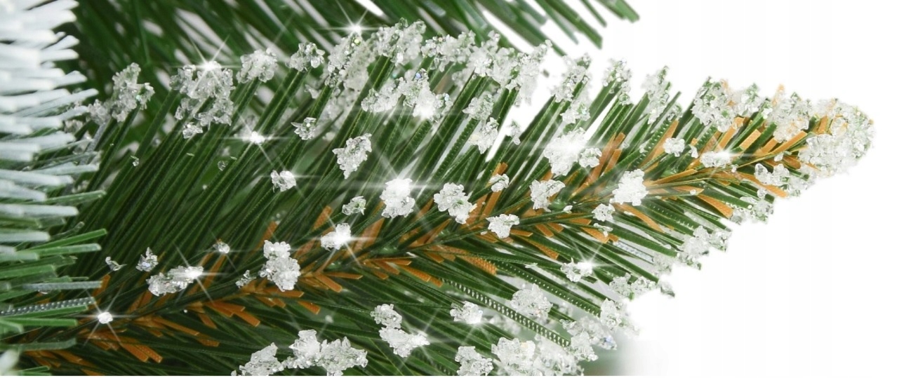 Кончики веточек украшены кристаллами, поэтому они выглядят матовыми и красиво переливаются на свету. Зеленые ветки расположены густо, благодаря чему елка выглядит очень эстетично.