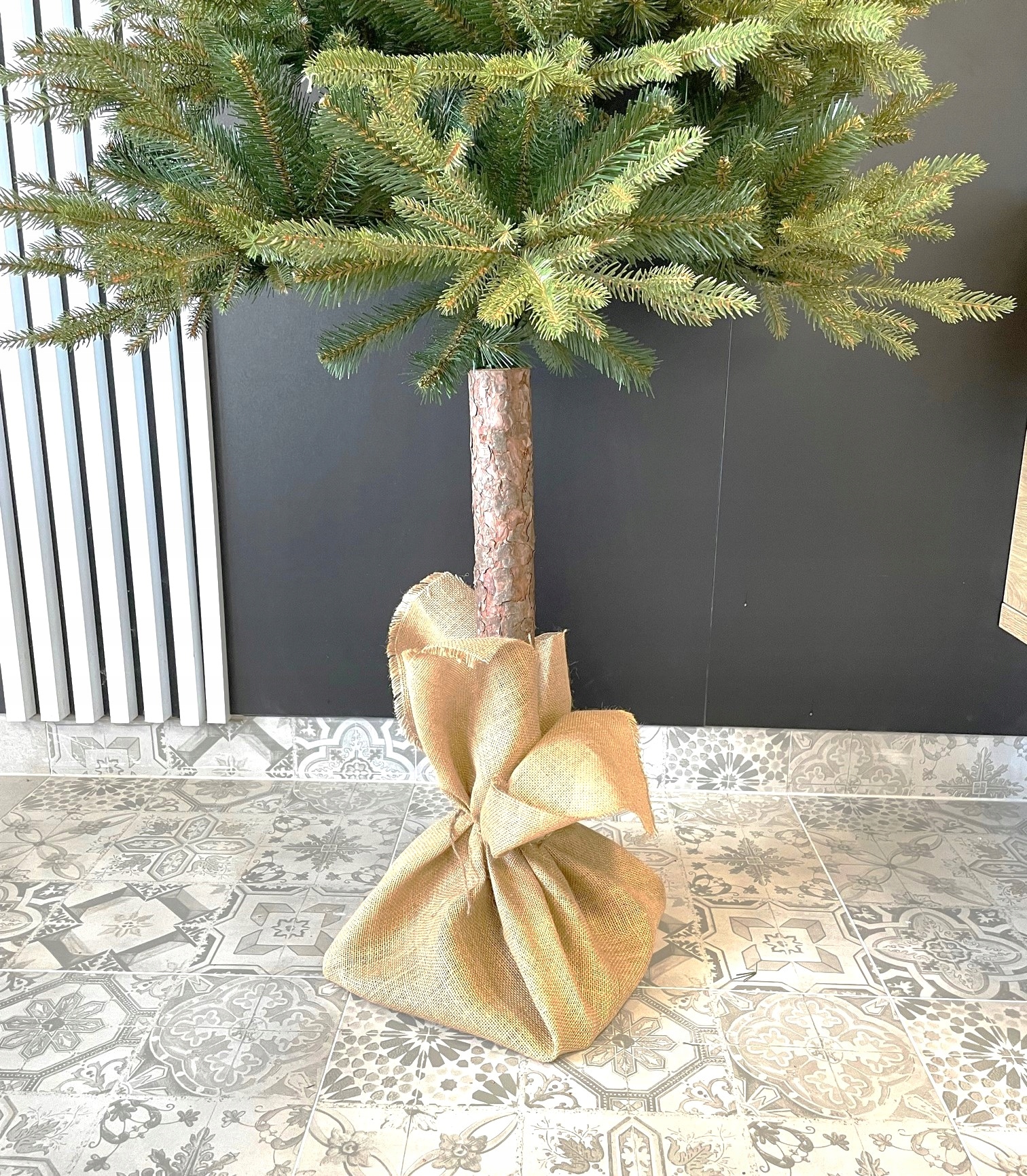 На аукционе участвует: комплектная новогодняя елка с основой из натурального ствола, джута и основы. Судя по фото, елка изготовлена из веток ПЭ, наполнитель елки - идеально подобранный материал ПВХ.