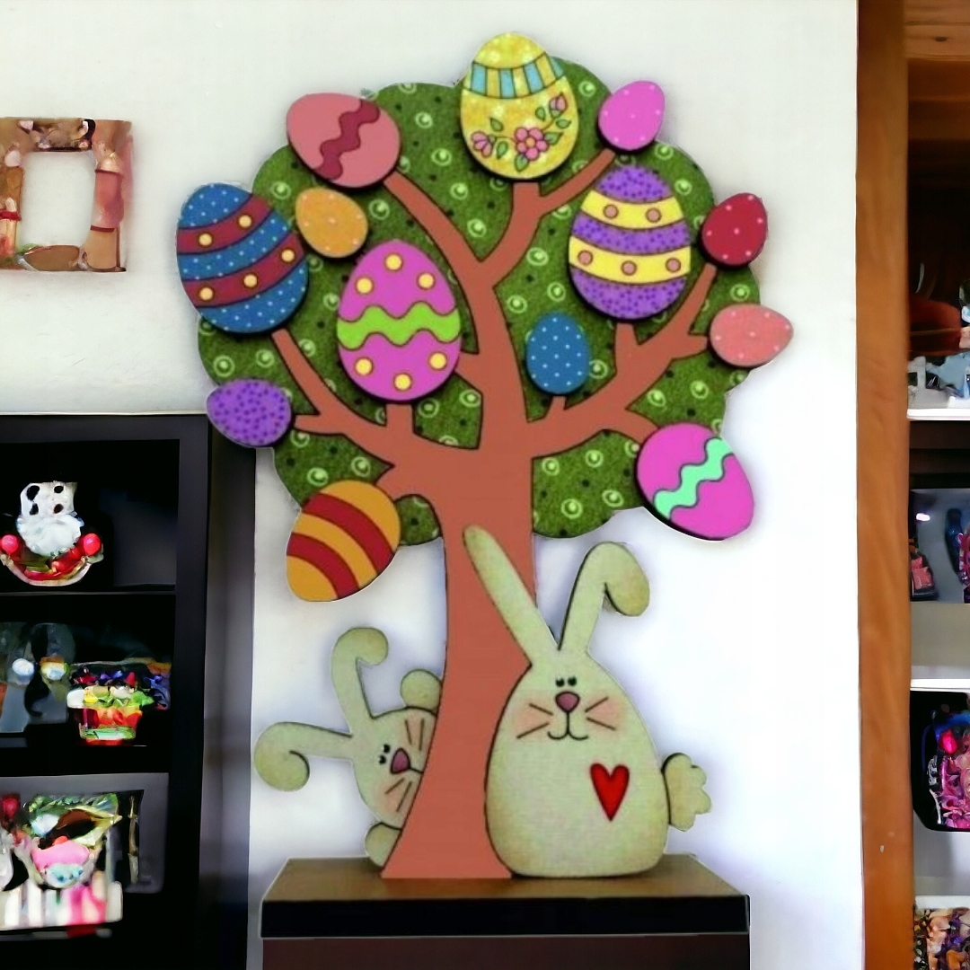 - Ёлка ставится на подставку, дополнительно имеет зайчиков и пасхальные яйца, которые после декорирования в любой технике (мелки, краски) можно приклеить к ёлке. , что делает украшение объемным. Это понравится каждому ребенку.