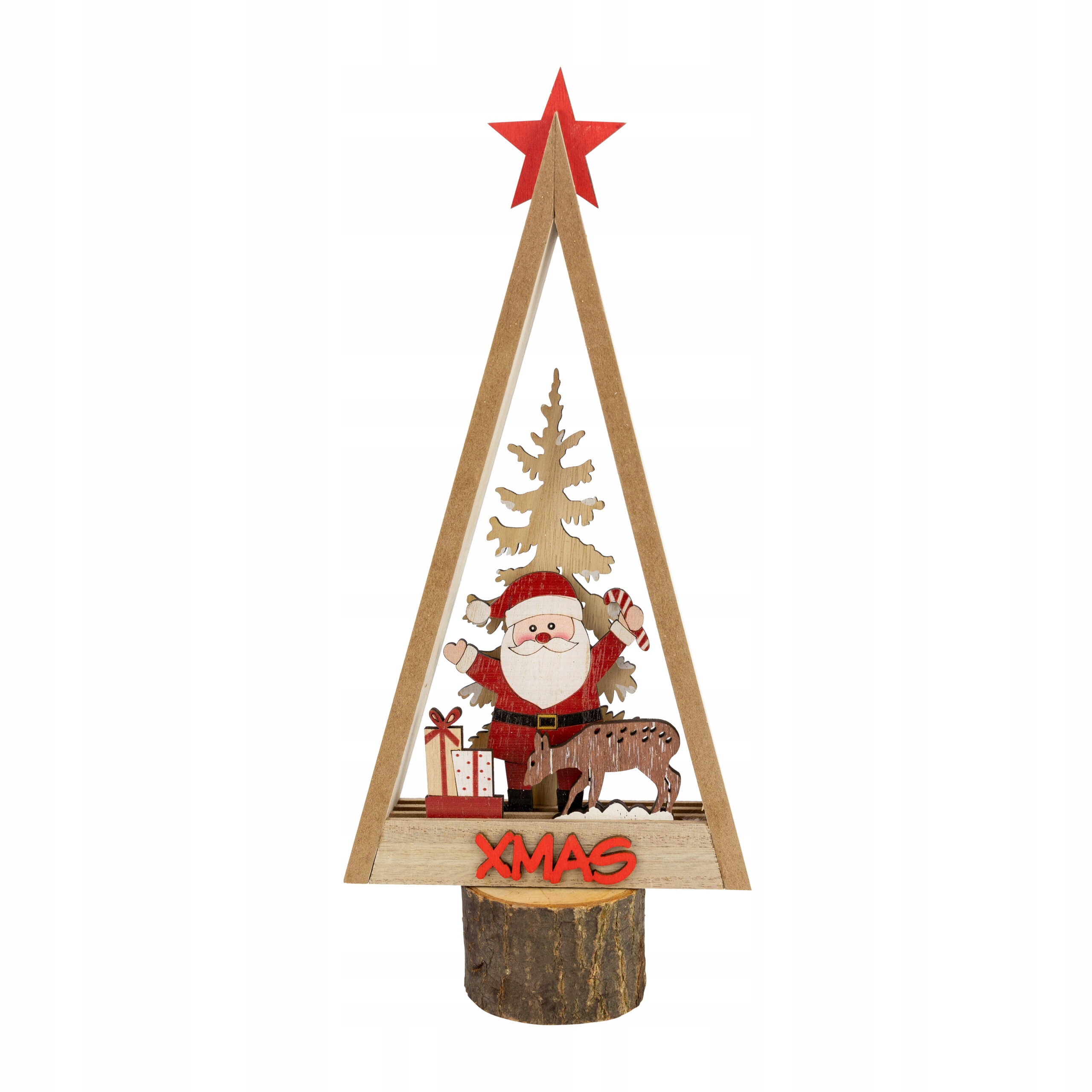 Елка высотой 34 см, полностью изготовлена из дерева. Внутри елки находится рождественская 3D-иллюстрация, на которой изображена маленькая елочка, Дед Мороз, олень, подарки и надпись X-mas, а также красная звезда на самом верху.