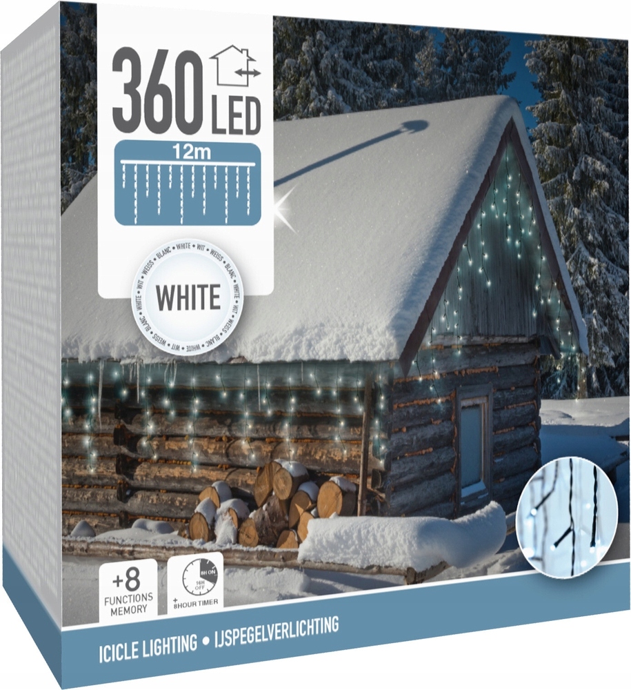 Эта штора оснащена 360 светодиодами холодного белого света. Он предлагает широкий спектр возможностей для украшения любого места, например, сада, террасы, патио, компании или даже рождественской елки. Он энергосберегающий и не требует обслуживания. Он имеет водонепроницаемость IP44 и 8 функций. Упакован в коробку.