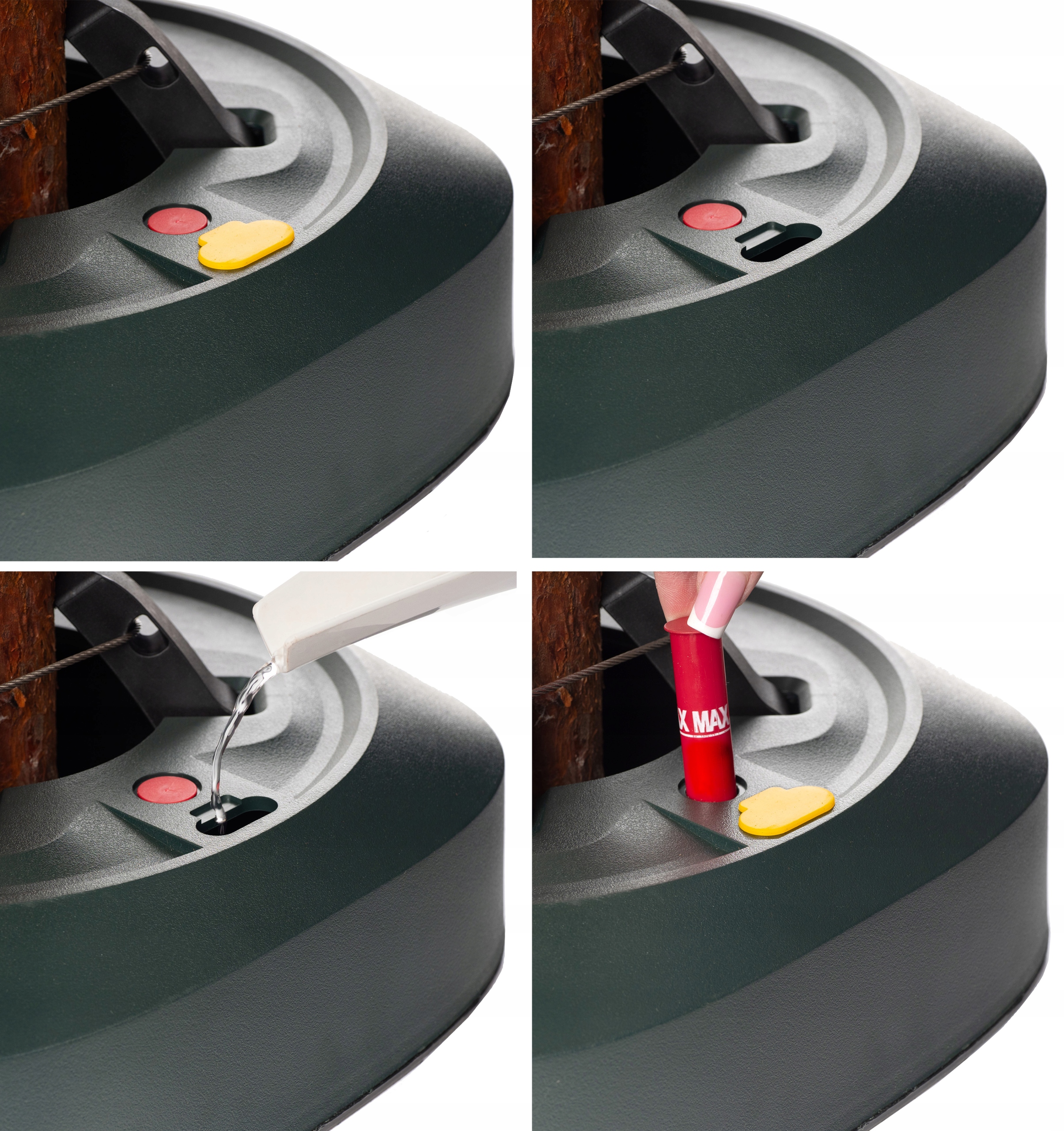Основание подставки имеет размеры 32 х 32 см, а отверстие, в котором можно разместить ствол дерева диаметром 3-13 см в зависимости от регулировки.