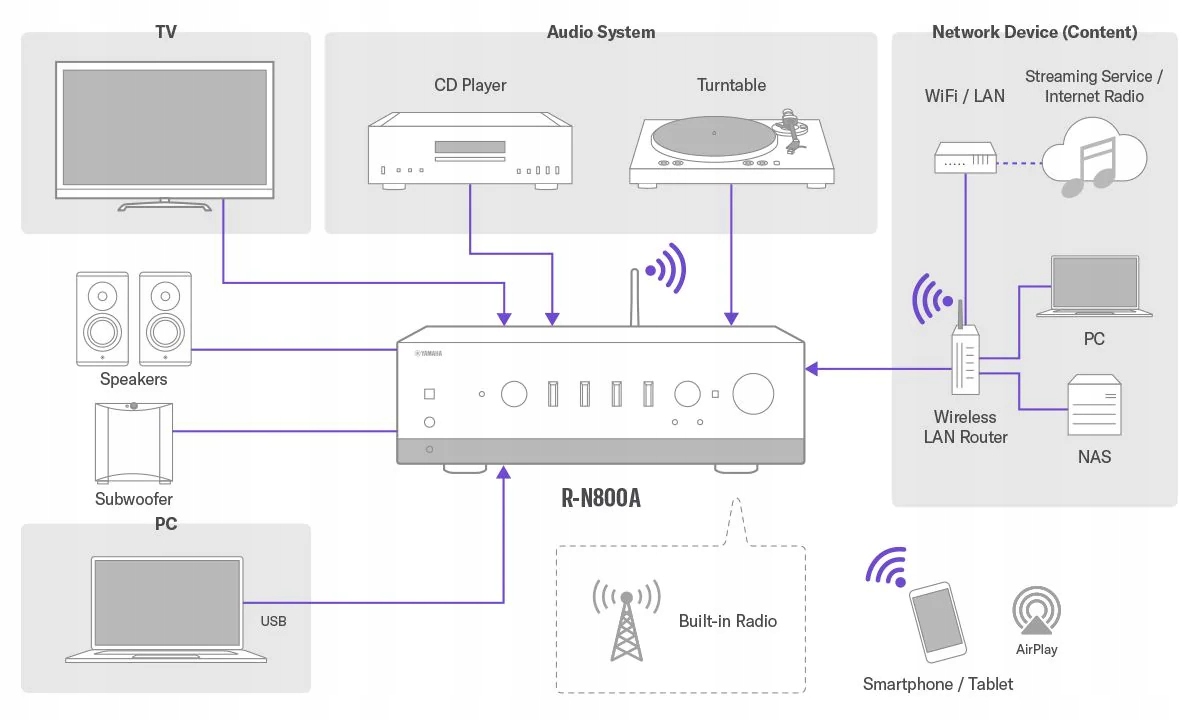 Yamaha может похвастаться более чем 60-летней историей аудиобренда. Технология, используемая в R-N800A, заимствована непосредственно из легендарной концепции дизайна Hi-Fi ToP-ART (Total Purity Audio Reproduction Technology) компании Yamaha, которая надежно сохраняет целостность звука за счет тщательного сочетания симметричных левых и правых схем и кратчайших путей прохождения сигнала с корпус с низким уровнем вибрации, высокая жесткость, оснащен специальной рамой «Art Base», которая поглощает и блокирует ненужные вибрации. Это обеспечивает чистый и динамичный звук.