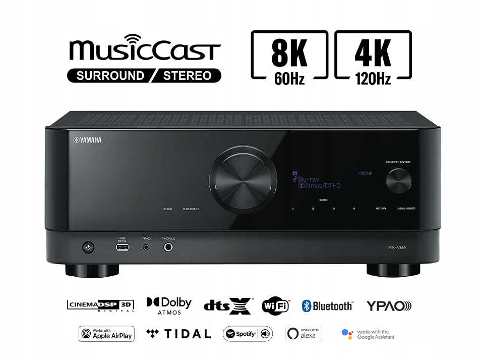 Yamaha MusicCast RX-V6A — флагманская модель серии RX-V, оснащенная несколькими портами HDMI (7 входов/1 выход). Следует подчеркнуть, что 3 входа HDMI поддерживают разрешение 8K/60 Гц*, что делает его домашним развлекательным центром на долгие годы. Благодаря этому мы можем легко подключить множество устройств, поддерживающих разрешение 8K одновременно. , например консоли и проигрыватели Blu-Ray. Стоит отметить, что все входы совместимы с более ранними форматами, поэтому проблем с подключением устройств, поддерживающих разрешение 4K/120 Гц и ниже, не возникнет. Чтобы в полной мере воспользоваться поддержкой 8K, вам необходимо обновить программное обеспечение ресивера и 8K-совместимого телевизора.