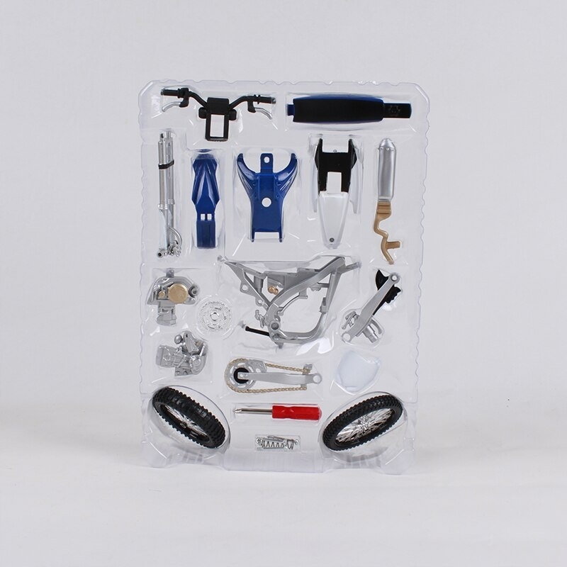 Мотоциклы имеют движущиеся части, окрашенные металлические и пластиковые элементы конструкции, резиновые колеса и амортизированную подвеску. После сборки мы получаем полнофункциональную подвижную машину, идеальную как игрушку для ребенка или модель для коллекционера.