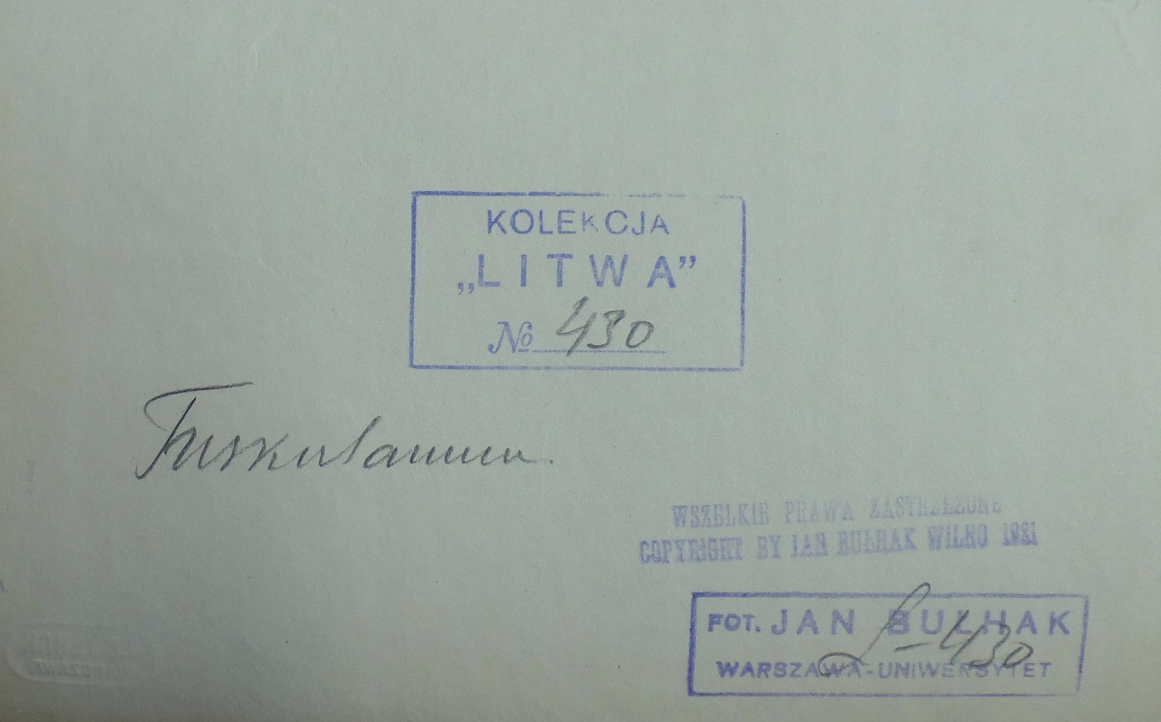Ян Булхак (1876-1950) «Тусккулярная» фотография на бумаге с размерами 11 x 16,2 см. На обороте отражена штамп «Коллекция Литвы с карандашом с надписью с номером« 430 », оригинальным названием карандаша, отраженными штампами и резервированием авторского права. Кроме того, в P/D углового сухого уплотнения.