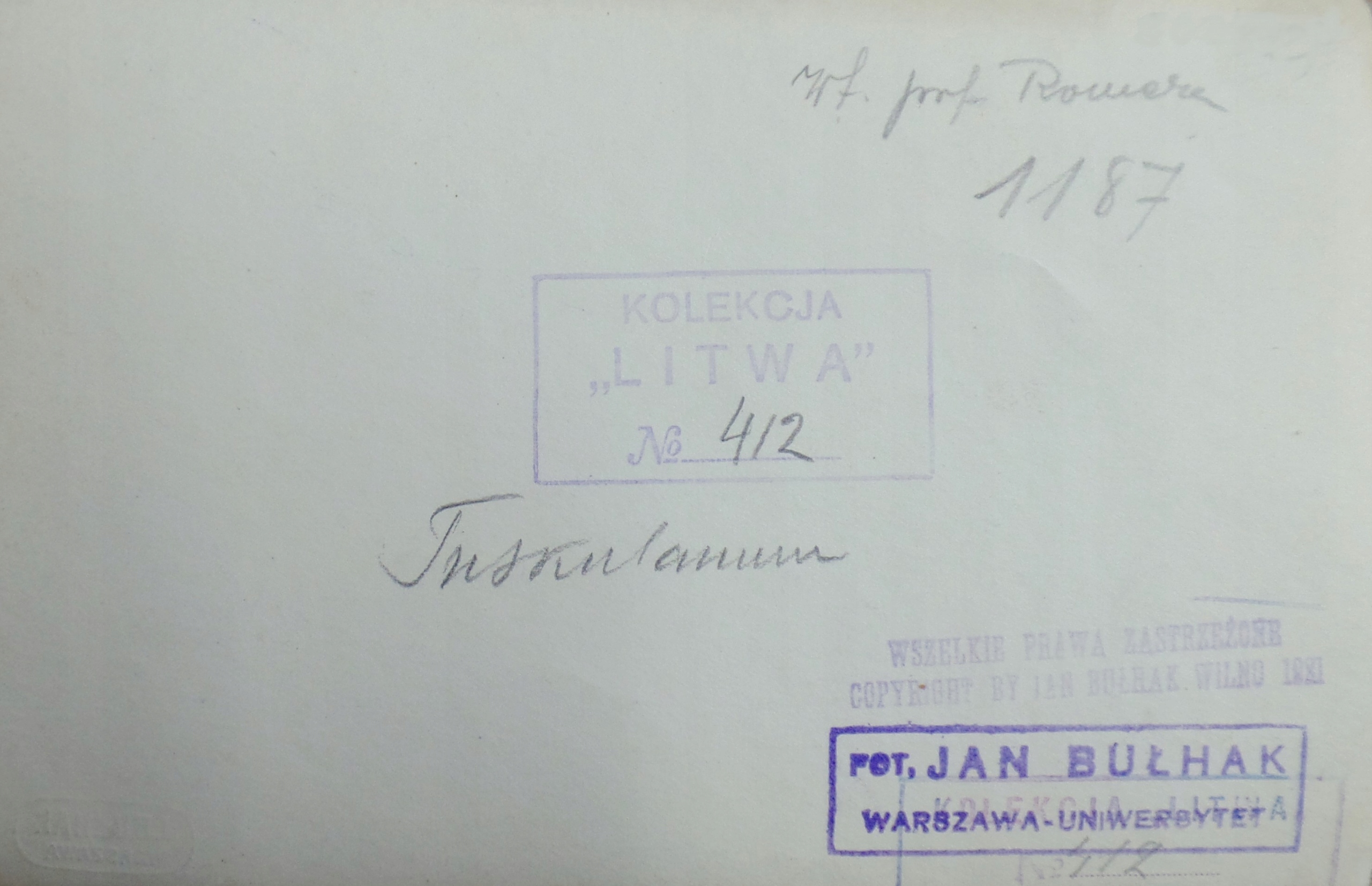 Ян Булхак (1876-1950) "Тусккулярная" фотография Сепии, Броми, на бумаге с размерами 9,8 х 16,3 см. На обороте отражена штамп «Коллекция Литвы с карандашом с надписью с номером« 412 »(в центре и в нижней части), оригинальный заголовок карандаша, отраженные штампы и права на схему. Кроме того, в угловом P/D сухой печать. Profes Romera/1187 "