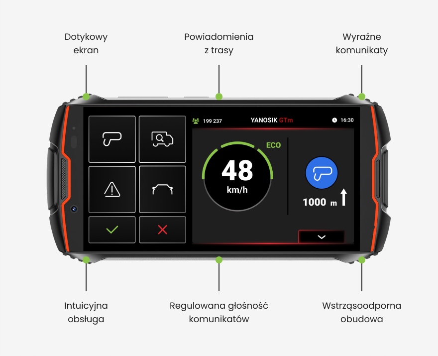 Yanosik GTm — новое компактное устройство в семействе Yanosik. Оснащенный сенсорным экраном, он обеспечивает интуитивно понятное и плавное управление. Вы можете установить их в свой автомобиль и быть в курсе всех событий на маршруте. Подключите их к приложению Y24 и получите: