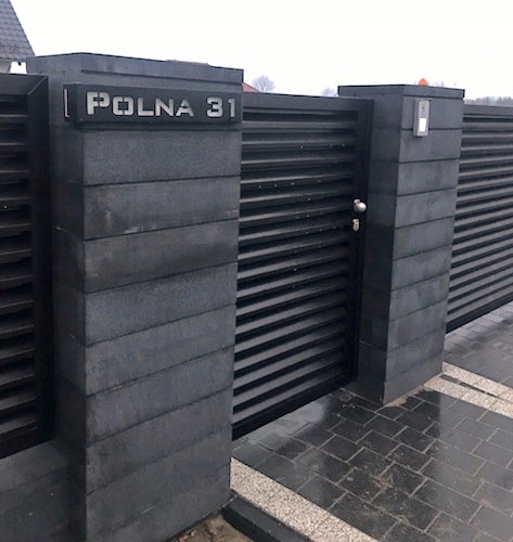 Адресная доска крепится к стойке. Столб забора или угловой фасад здания, забор из габиона (крепление габионом, дополнительная опция)
