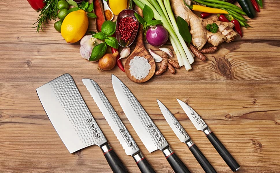 Серия Redline Hammered С ножами серии Redline Hammered вы хорошо подготовлены к любым применениям. В комплект входят нож-тесак, поварской нож, нож сантоку и нож для хлеба, а также два универсальных ножа разных размеров. На кухне больше удовольствия, будь то овощи, мясо, рыба или фрукты — нарезка и очистка не требуют усилий.